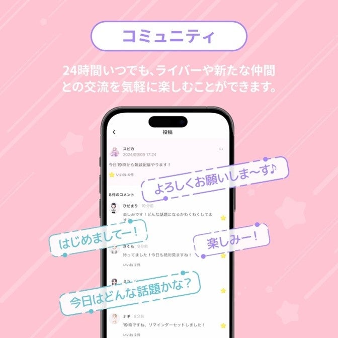 ステラミーではバーチャルライブ配信以外の時間も楽しんでいただけるよう、24時間参加可能なコミュニティ機能を実装しています。