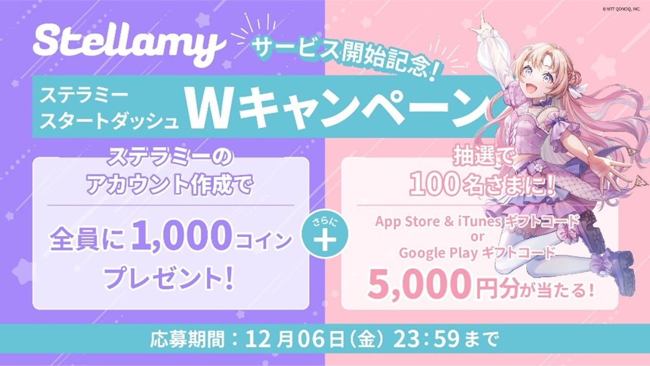 サービス開始を記念して、本日よりアプリ内で利用できる「1,000コイン」やApp Store&iTunesギフトコード、または、Google Playギフトコード 5,000円分があたる「ステラミースタートダッシュWキャンペーン」(以下、本キャンペーン)を開催します。
