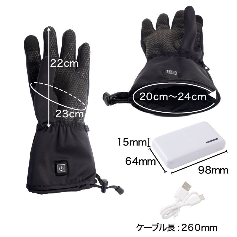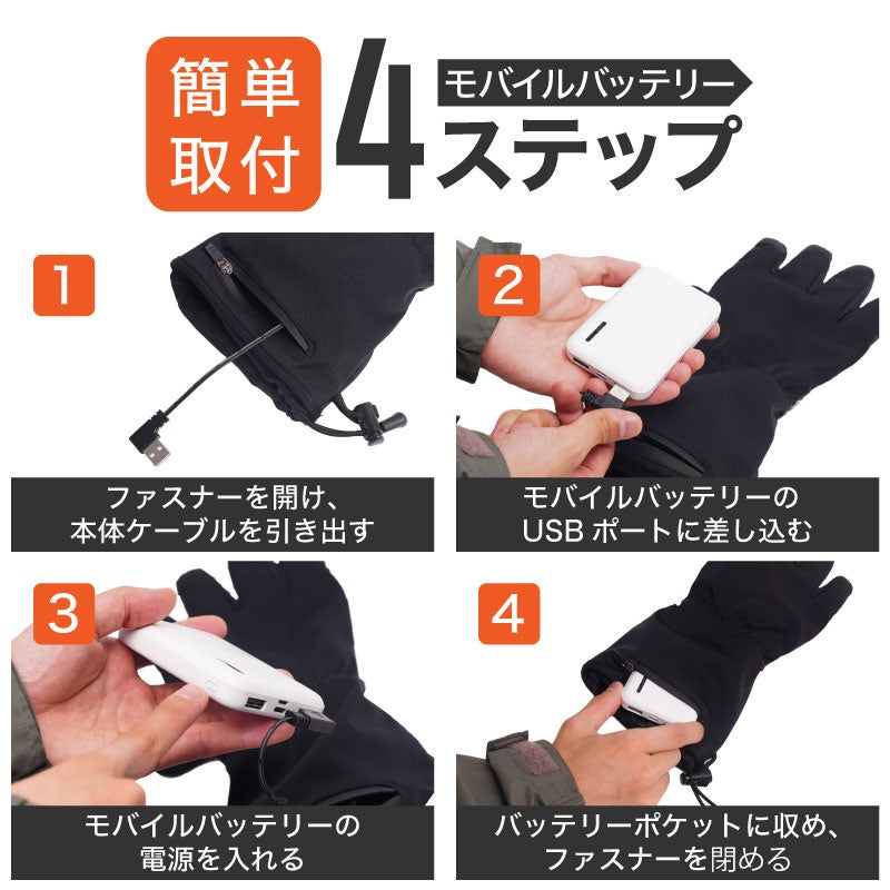 本製品はヒーターを搭載したあったか手袋です。5000mAhのモバイルバッテリーが2個付属。USB給電式。手首外側上部のUSBケーブルを付属のモバイルバッテリーに左右それぞれ接続して使用。モバイルバッテリーは上部のポケットに収納が可能です。