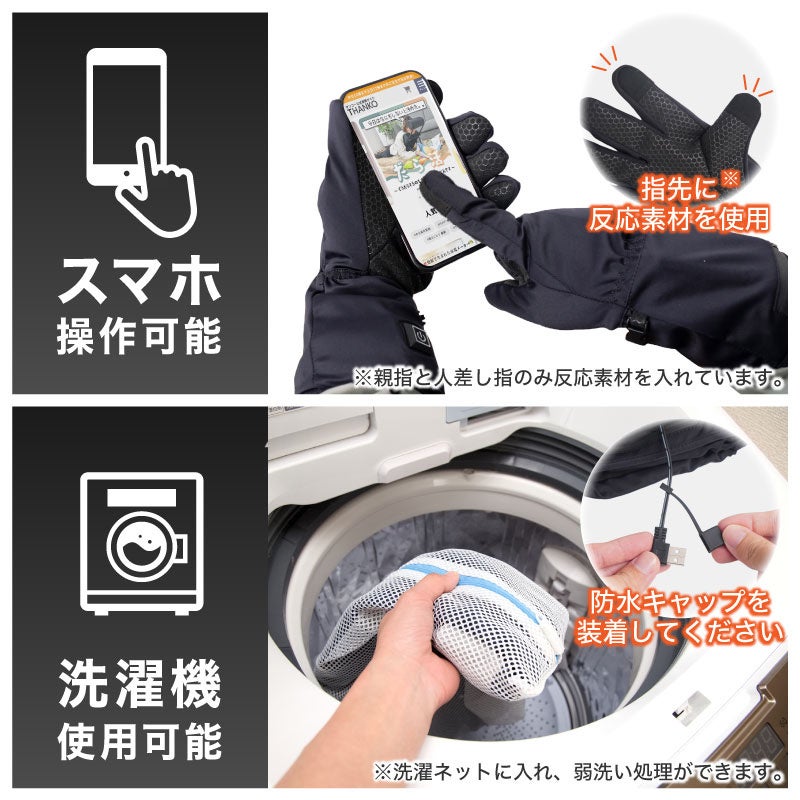 手のひら側手首部分の電源ボタンを長押しすると電源が入り、指先や手の甲の部分に搭載されたヒーターが温まります。3段階の温度切り替えが可能。LEDランプの色で設定温度をお知らせします。高(赤)約50度、中(青)約45度、低(緑)約40度。左右それぞれ設定が可能。人差し指と親指部分には特殊素材を加工し、手袋をしたままでもスマホ操作が可能です。汚れたら洗濯機で洗濯可能。いつでも清潔にお使いいただけます。