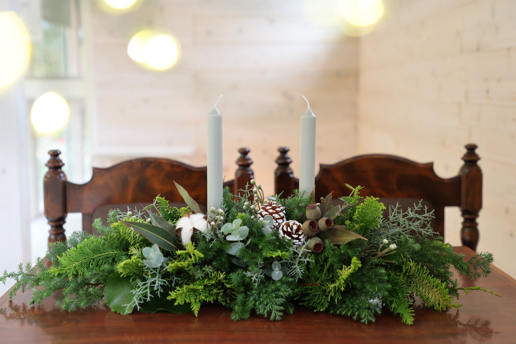 生のグリーンをたっぷり使って作る、まるで森の中にいるような気分になれるセンターピースです。キャンドルに火を灯すとクリスマス気分が盛り上がります。今年のクリスマスはセンターピースを飾ってみませんか。