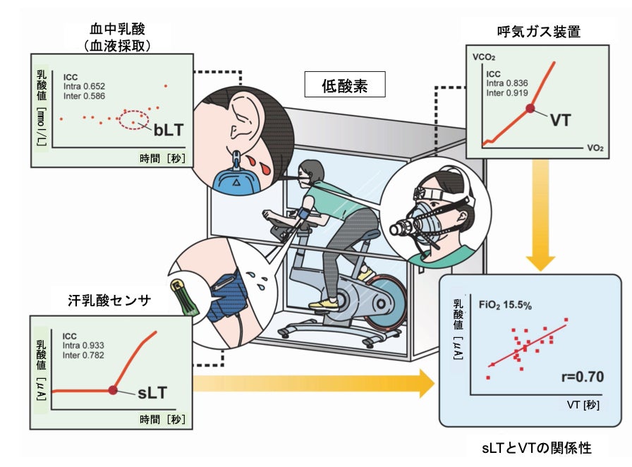 慶應義塾大学医学部スポーツ医学総合センターの勝俣良紀専任講師、同整形外科学教室の大川原洋樹研究員らと、株式会社グレースイメージング(代表取締役CEO 中島大輔)の共同研究グループは、常酸素環境と同様に低酸素環境下での運動においても、ウェアラブル汗乳酸センサを用いて汗乳酸値をリアルタイムにモニタリングすることで簡便に求められる汗乳酸性閾値(sLT)が、嫌気性代謝閾値(AT)の指標として優れた信頼性・妥当性を有することを明らかにしました。
