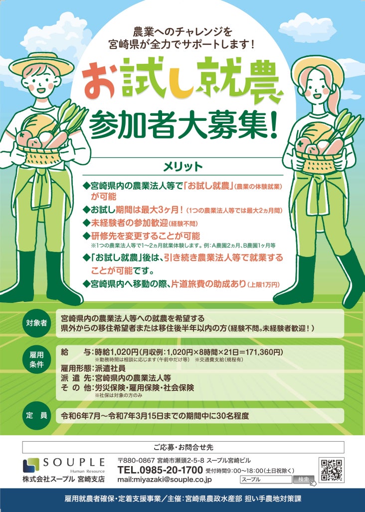 d115850-117-b967de05068f966db179477efa3ce9fe.pdf宮崎県は、雇用就農の受入れ・定着促進を目的として、宮崎県内の複数の農業法人で農業を体験できる「お試し就農」を実施しています。現在、参加者を絶賛募集中です!