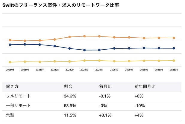 働き方ではフルリモート34.6%、一部リモート53.9%と在宅を含む案件が合計88.5%に達しており、個人作業との親和性が高いSwiftの開発特性からリモート環境との相性が良く、安定したリモートワーク比率を維持しています。