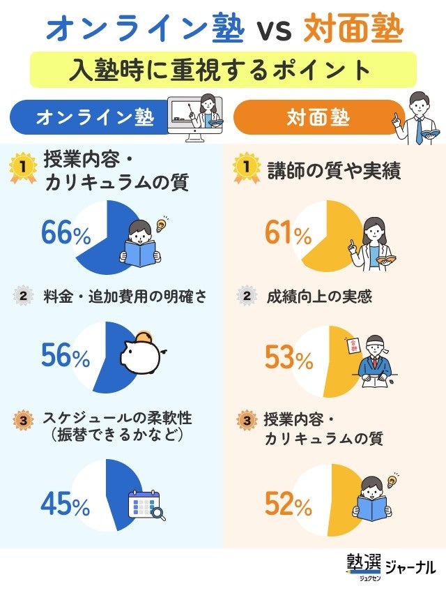 オンライン塾と比較して、「講師の質や実績」を重視する声が多く、人による介在価値や成績向上の確実性が強く求められていることがわかります。