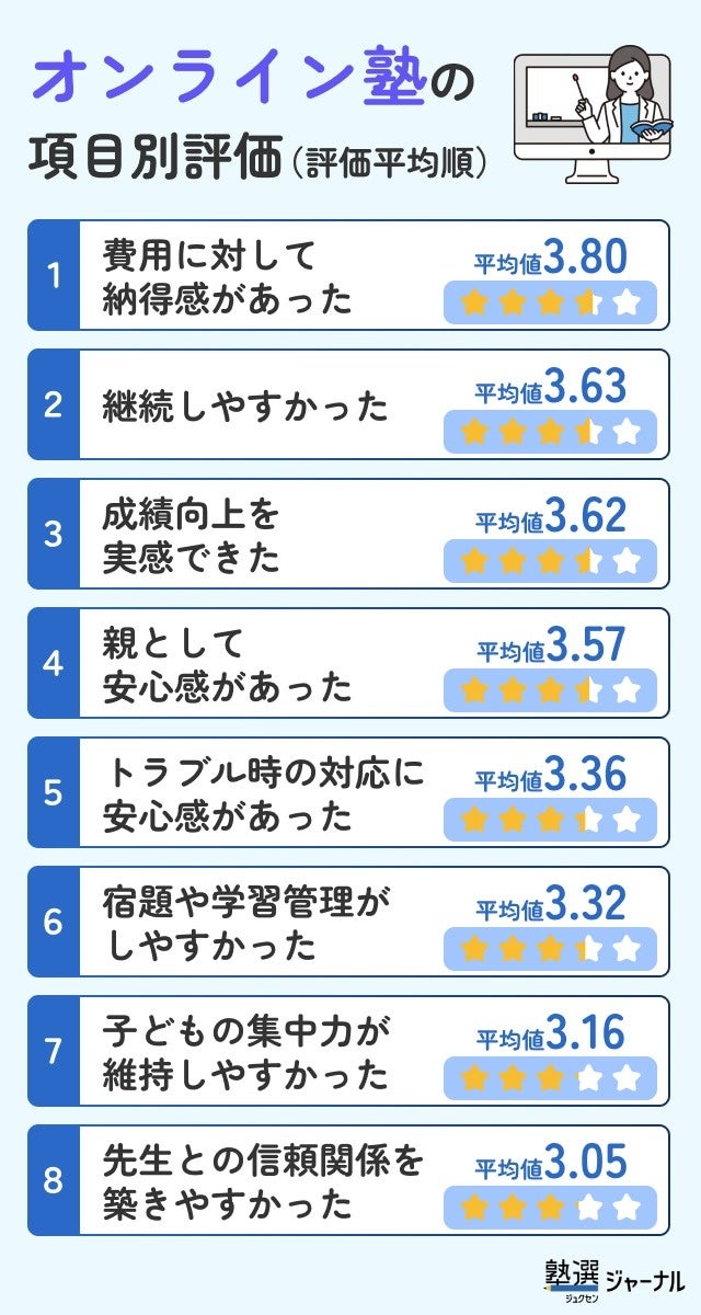 オンライン塾の評価項目のなかで最も高かったのは「費用に対する納得感があった」でした。