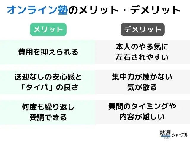 オンライン塾には「費用や時間の効率の良さ」や「繰り返し学習のしやすさ」といったメリットがある一方で、「本人のやる気」や「主体性」に影響されやすいという側面もあるようです。