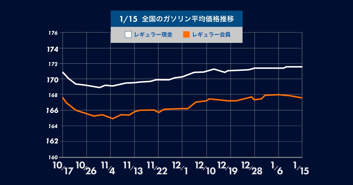 1月15日(月) 時点のレギュラーガソリンの全国平均は、171.6円となり先週から0.2円の値上がり。2週間ぶりの値上がりとなりました。