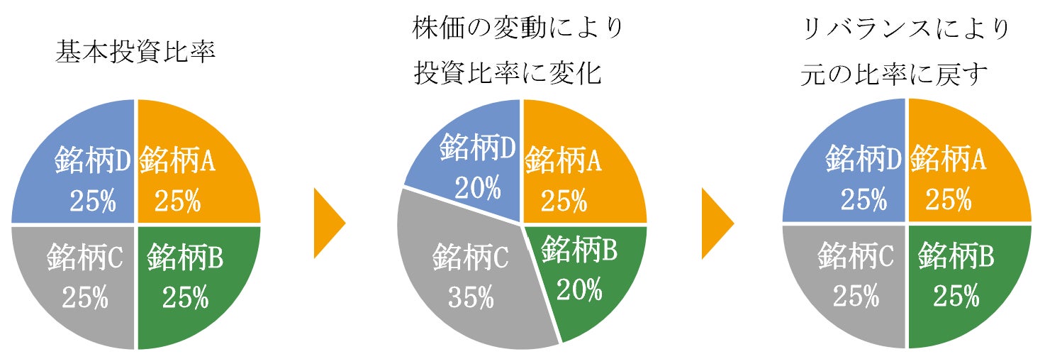 株価の変動により変化した投資比率を均等に戻すために、定期的なリバランスが実施される。 |