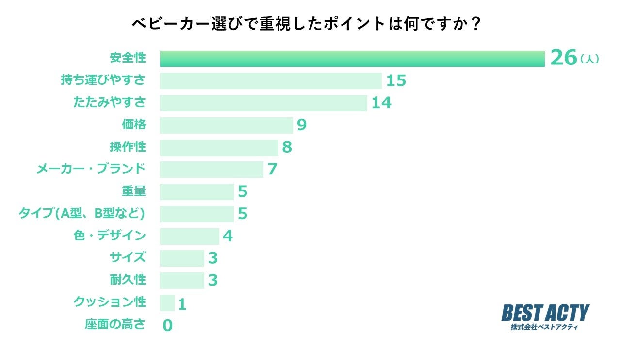 ベビーカー選びで重視したポイントについて100人にアンケートを行ったところ、「安全性」と回答する人が最も多い結果となりました。