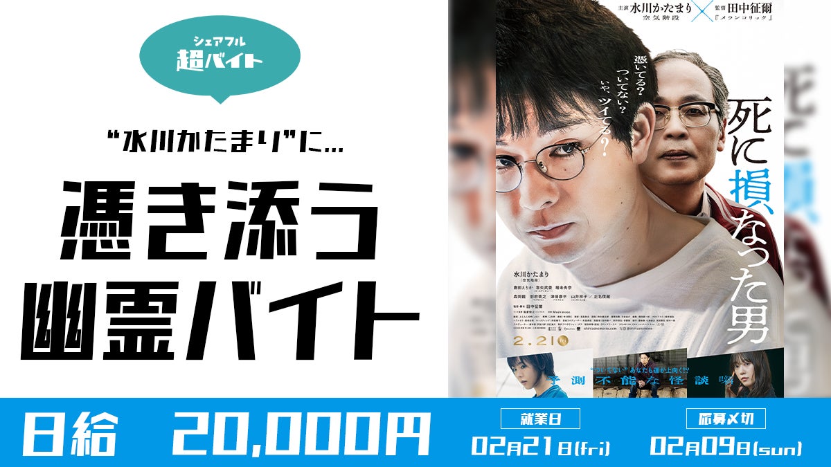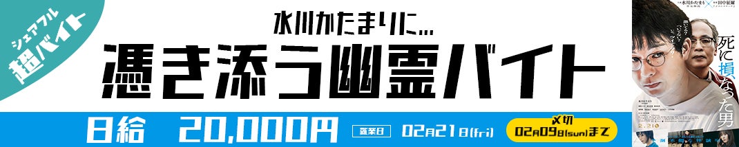 今回の超バイト企画では、2025年2月21日(金)に行われる、空気階段水川かたまり主演の映画『死に損なった男』の舞台挨拶にて、キャストに “憑き添う幽霊バイト”の超バイトを募集します。