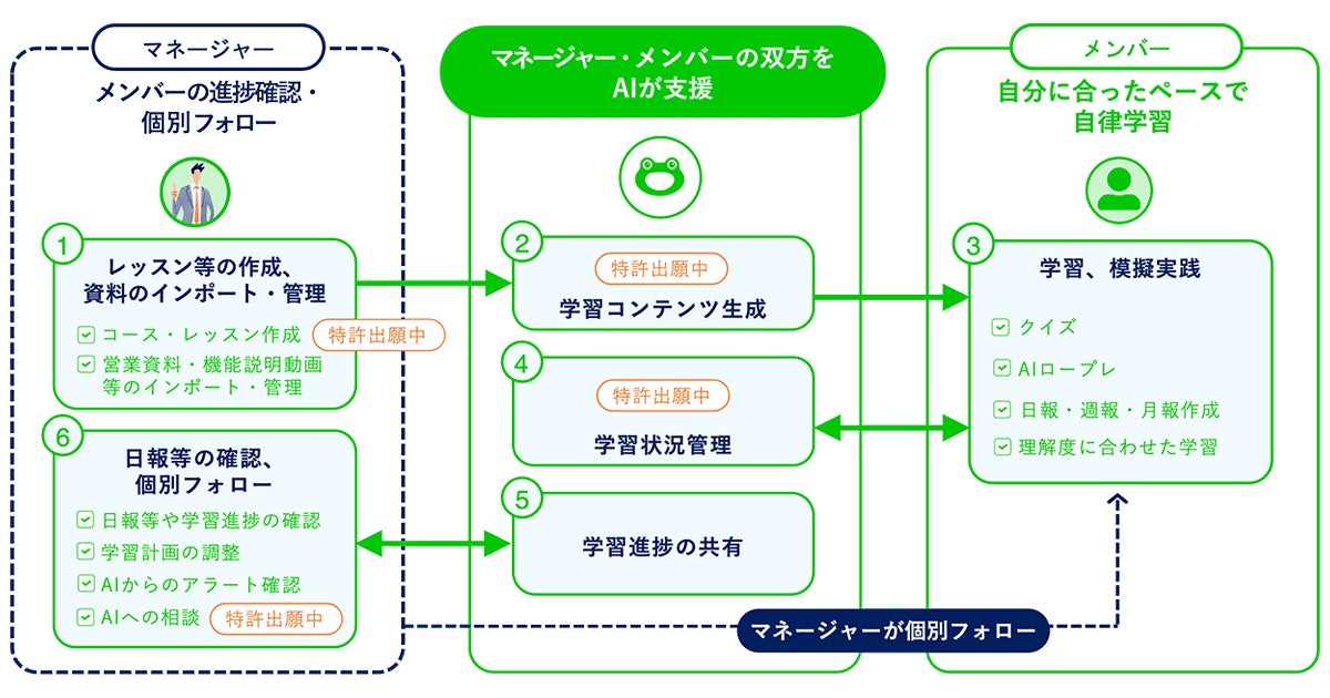 メンバーの日報などを一覧で確認でき、学習進捗や状況を効率的に把握できます。また、生成AIがメンバーの学習の遅れや心境変化を察知し、マネージャーに対して個別フォローやネクストアクションを的確なタイミングで提案します。