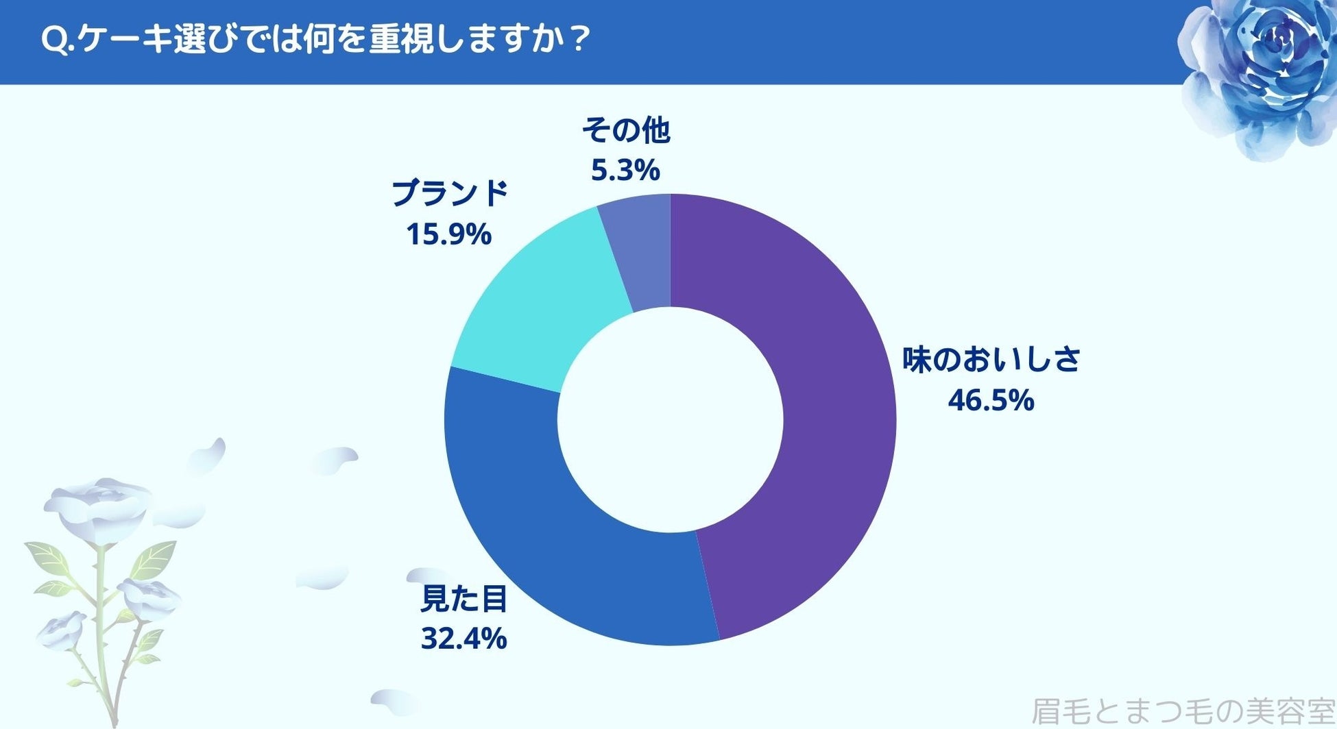 ケーキ選びで何を重視しているかお聞きしたところ「味のおいしさ(46.5%)」、「見た目(32.4%)」、「ブランド(15.9%)」、「その他(5.3%)」という結果になりました。