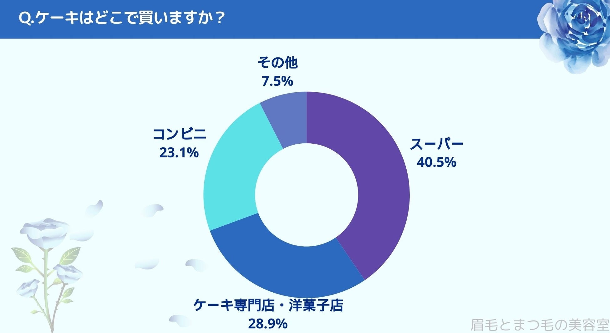 ケーキをどこで買うのかお聞きしたところ「スーパー(40.5%)」、「ケーキ専門店・洋菓子店(28.9%)」、「コンビニ(23.1%)」、「コンビニ(23.1%)」、「その他(7.5%)」という結果になりました。