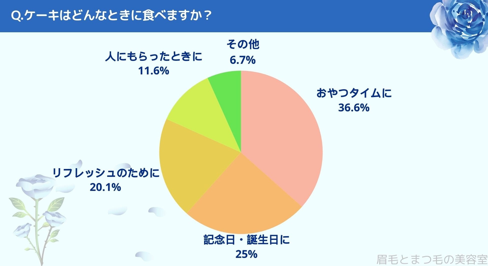 ケーキはどんなときに食べるかお聞きしたところ「おやつタイムに(36.6%)」、「記念日・誕生日に(25%)」、「リフレッシュのために(25%)」、「リフレッシュのために(20.1%)」、「人からもらったときに(11.6%)」、「その他(6.7%)」という結果になりました。