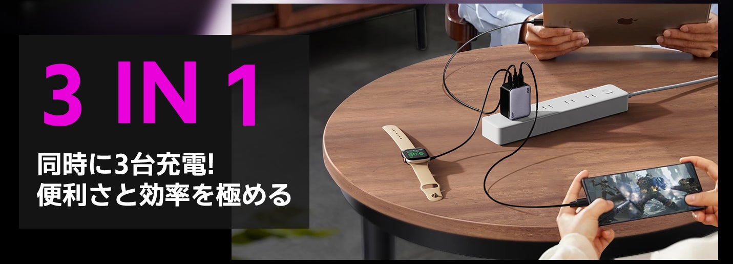AFASTYの充電器は、Type-Cポートを2つ、USB-Aポートを1つ搭載し、3台のデバイスを同時に充電できます。ノートパソコン、スマートフォン、タブレットなど、さまざまなデバイスに対応し、充電待ちのストレスを解消します。家族や同僚と共有するのにも最適で、リビングやオフィスでも複数のデバイスを同時に充電可能です。