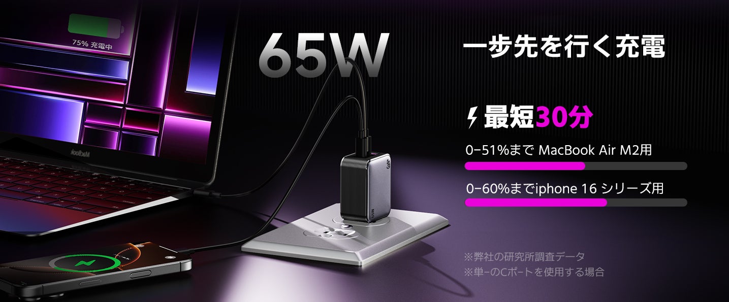 AFASTYの充電器は、まさに「まるで光速!」のパフォーマンスを発揮します。最新のPower Delivery (PD)およびQuick Charge (QC)技術を搭載し、わずか30分でMacBook Air M2を51%、iPhone 16を60%まで充電可能です。外出前や緊急時にバッテリー切れを心配する必要がなくなります。充電時間が短縮されることで、より充実した時間を過ごすことができます。