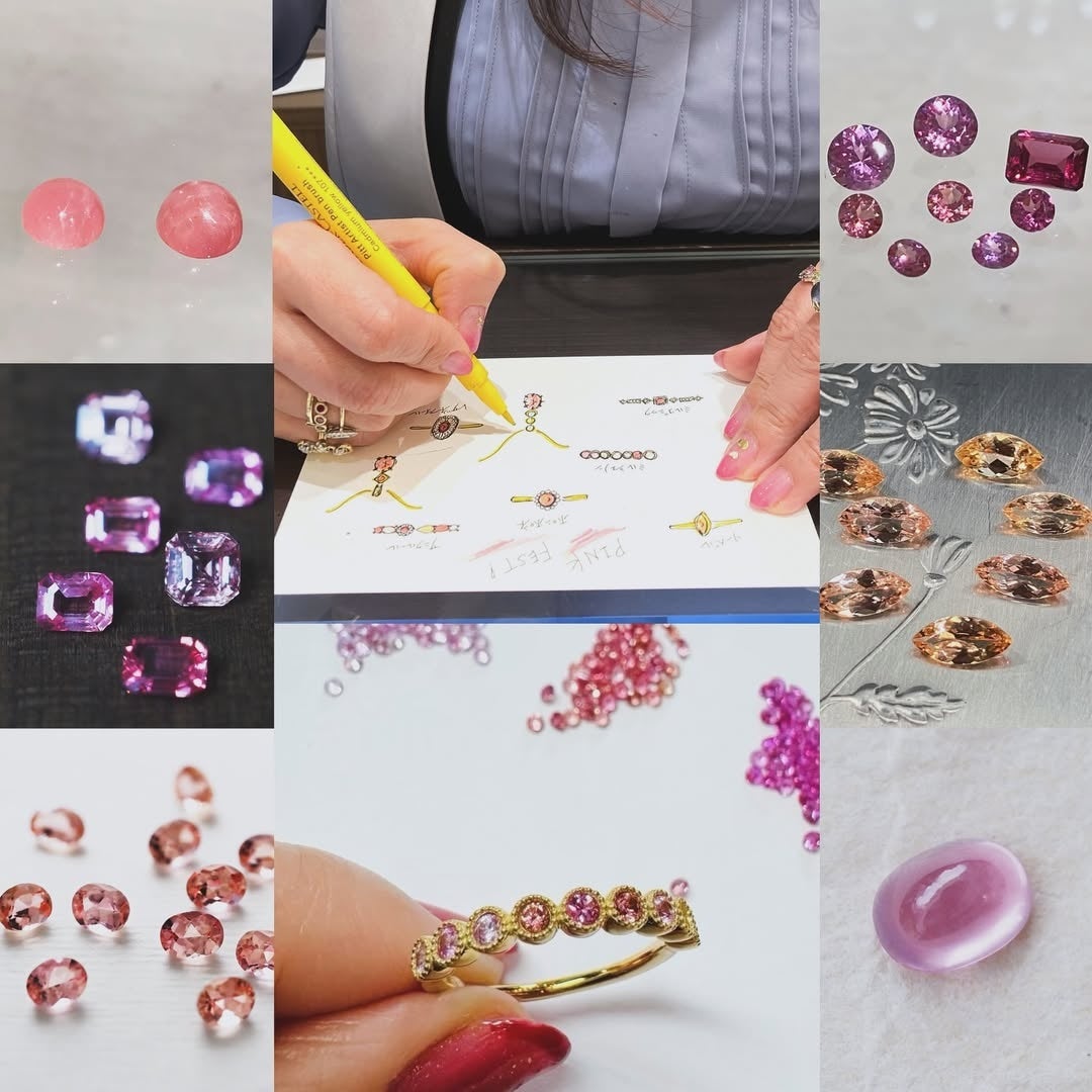 ピンクの宝石といえば、ピンクダイヤモンド、ルビー、サファイア、スピネル、トルマリン、モルガナイト、クンツァイト、ローズクォーツ、アメシスト、ジルコン、マラヤ、シャンパンガーネット、ロードクロサイト、インペリアルトパーズ、珊瑚、コンクパール、真珠など、種類も豊富。産地やカット、形状が異なることで、同じピンクでもまったく異なる表情を見せるのが魅力です。