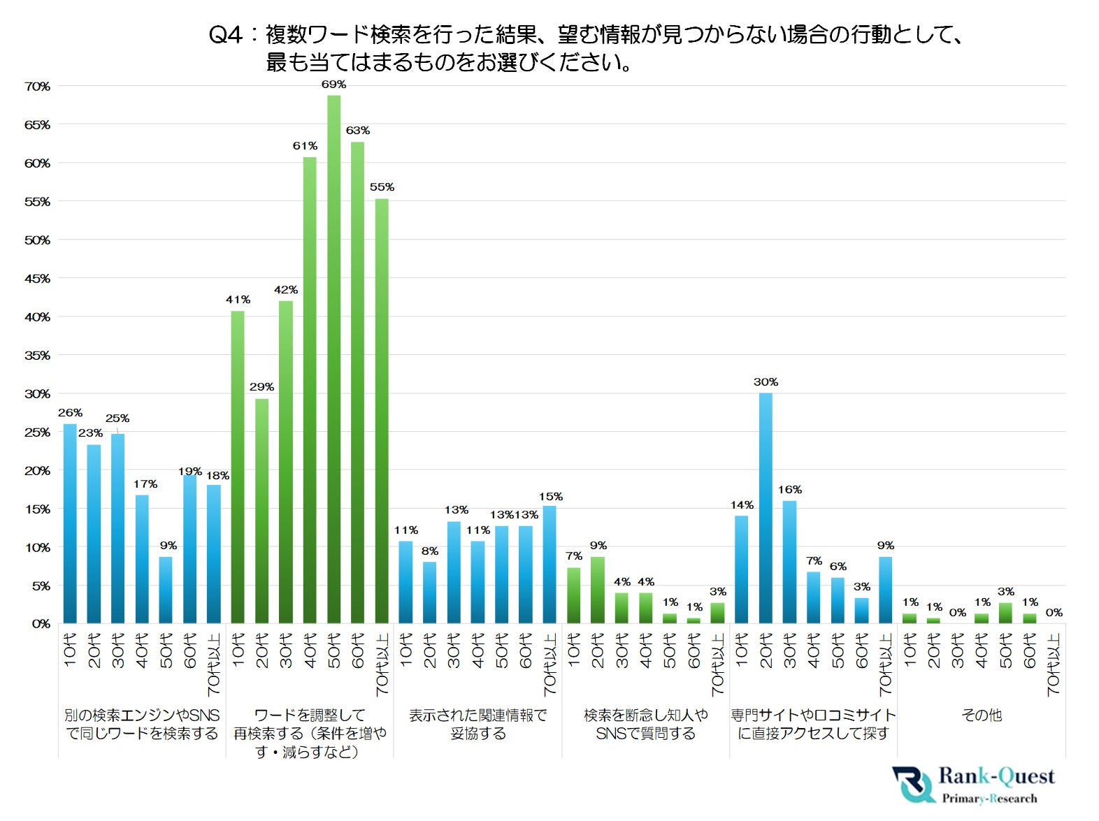 「ワードを調整して再検索」はすべての年代で最多の行動ですが、特に50代(69%)、60代(63%)、40代(61%)で強く表れます。中高年層向けにはロングテールキーワードや関連語句を豊富に取り入れたコンテンツが効果的です。