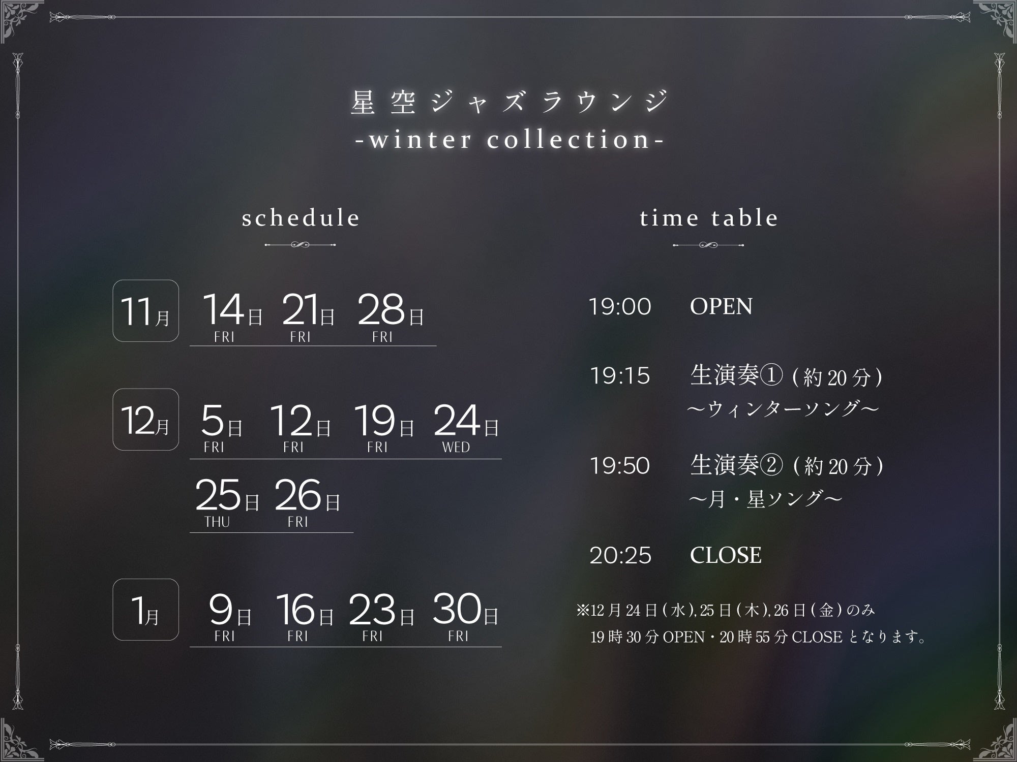 コニカミノルタプラネタリアTOKYOで人気公演『Planetarium Concert』に出演中の、プロの演奏家によるジャズの生演奏を星空の下でお届けします。ピアノ、サックス、コントラバスという五感を研ぎ澄ますことができるプラネタリウムならではの編成のもと、ウィンターソングや映画音楽など、誰もが耳にしたことのある名曲を、温もりあるアコースティックサウンドでアレンジ。静かな夜に溶け込むようなバラードから、心が弾むスウィングナンバーまで、約40分のセッションをお届けします。