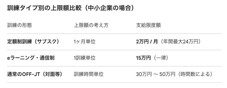 当社の研修は「人材開発支援助成金(事業展開等リスキリング支援コース・定額制訓練)」に該当し、条件を満たす場合には最大で月額2万円を上限に助成が受けられます。今回の改訂においても変更はありません。