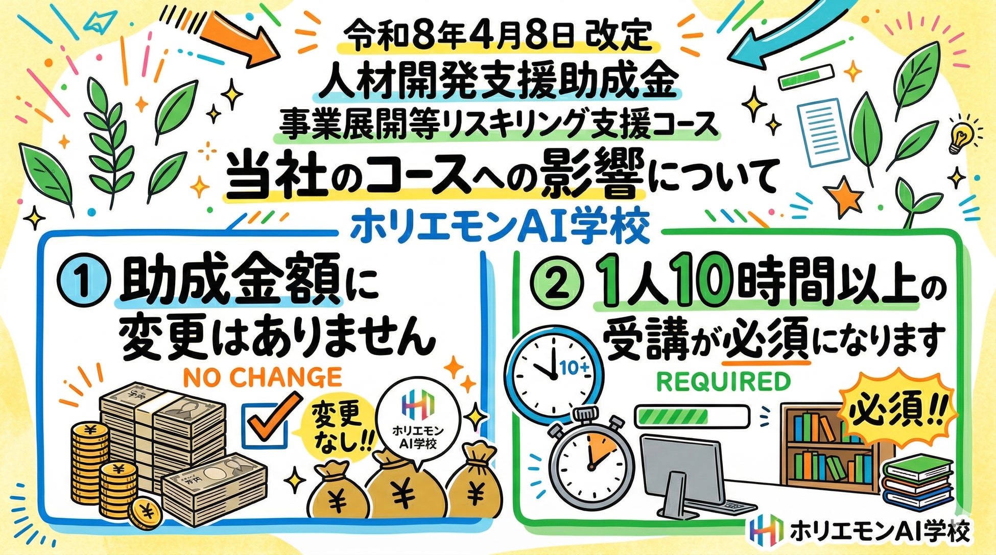 企業向けAI研修・コンサルティングを手掛けるホリエモンAI学校株式会社(本社:東京都新宿区、代表取締役社長:荒木 賢二郎、以下「ホリエモンAI学校」)は、令和8年4月8日に改定された「人材開発支援助成金(事業展開等リスキリング支援コース)」の改訂に関して、当社のお客さま、および今後ご検討の企業様への影響について公表いたします。