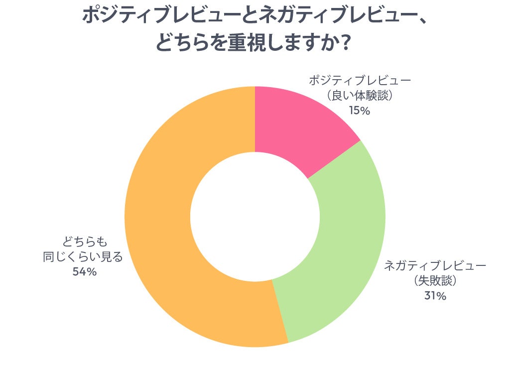 「ネガティブレビュー(失敗談)」31%、「どちらも同じくらい見る」54%と、85%以上が“失敗談にも目を通す”と回答しました。