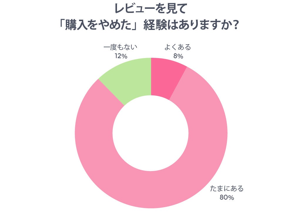 また、「レビューを見て購入をやめたことがある」と答えた人は88%(“よくある”8%+“たまにある”80%)にのぼり、ネガティブレビューが購入抑止のトリガーになっている現状も浮かび上がりました。