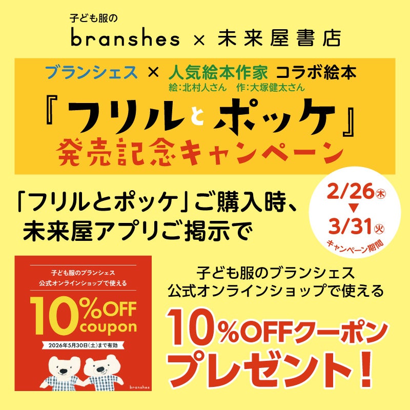 2026年2月26日(木)から3月31日(火)までの期間限定で、『フリルとポッケ』をご購入の際に「未来屋アプリ」をご提示いただくと、ブランシェス公式オンラインストアで使える10%OFFクーポンをプレゼントいたします。