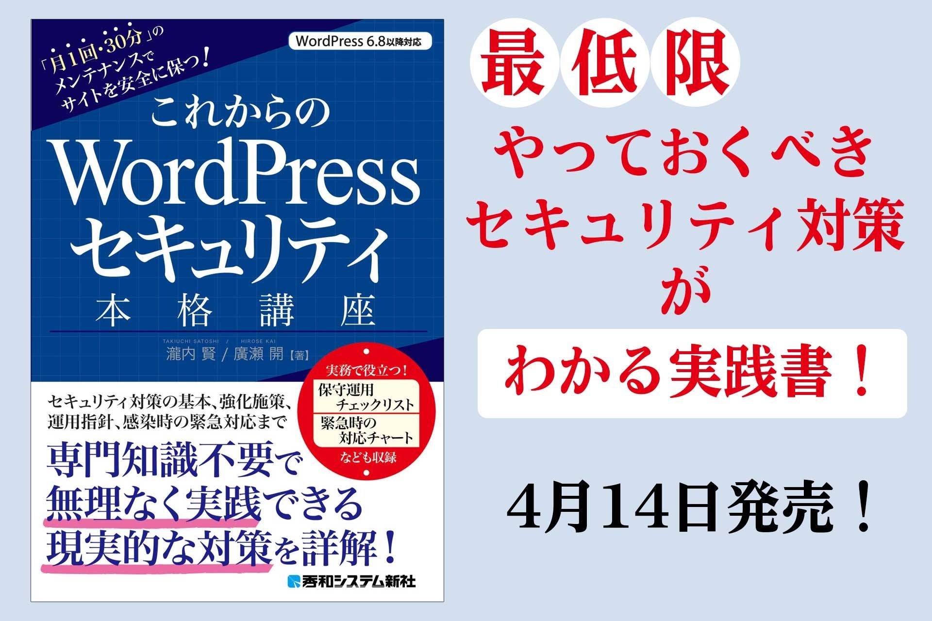 株式会社秀和システム新社(東京都千代田区・代表取締役 津島憲豪)は、2026年4月14日(火)、新刊『これからのWordPressセキュリティ本格講座』を発刊します。