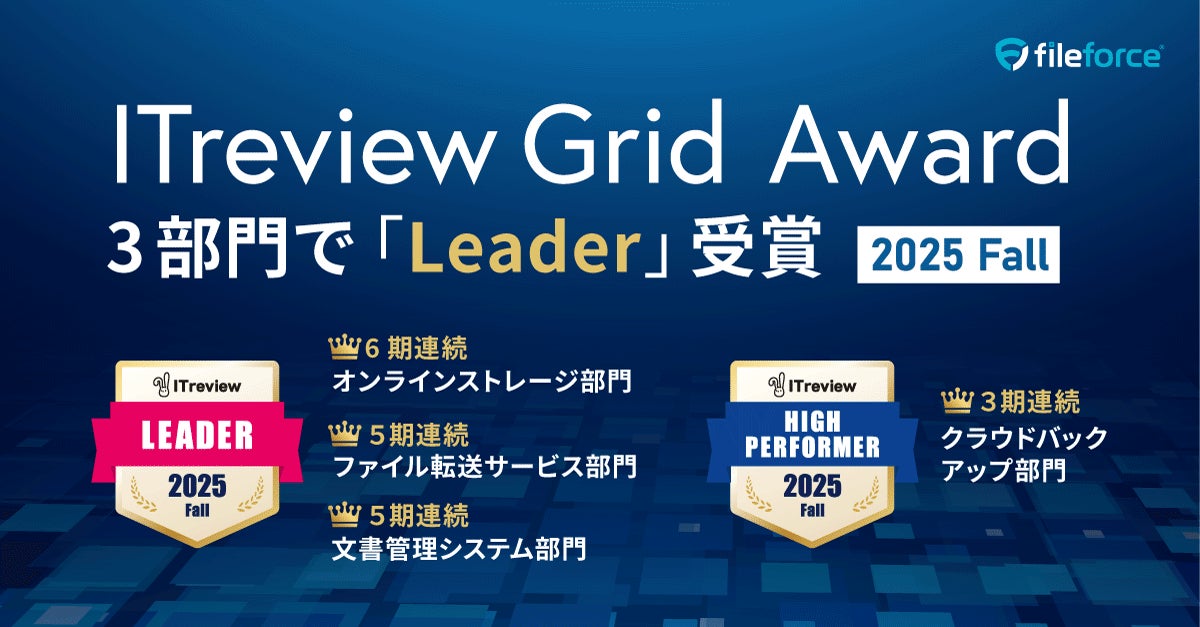 国産クラウドストレージFileforce「ITreview Grid Award 2025 Fall」オンラインストレージ他2部門で顧客満足度と認知度の双方に優れた称号「Leader」を受賞 6期連続