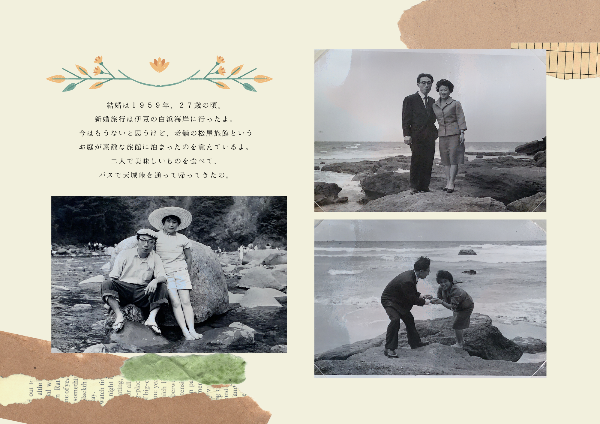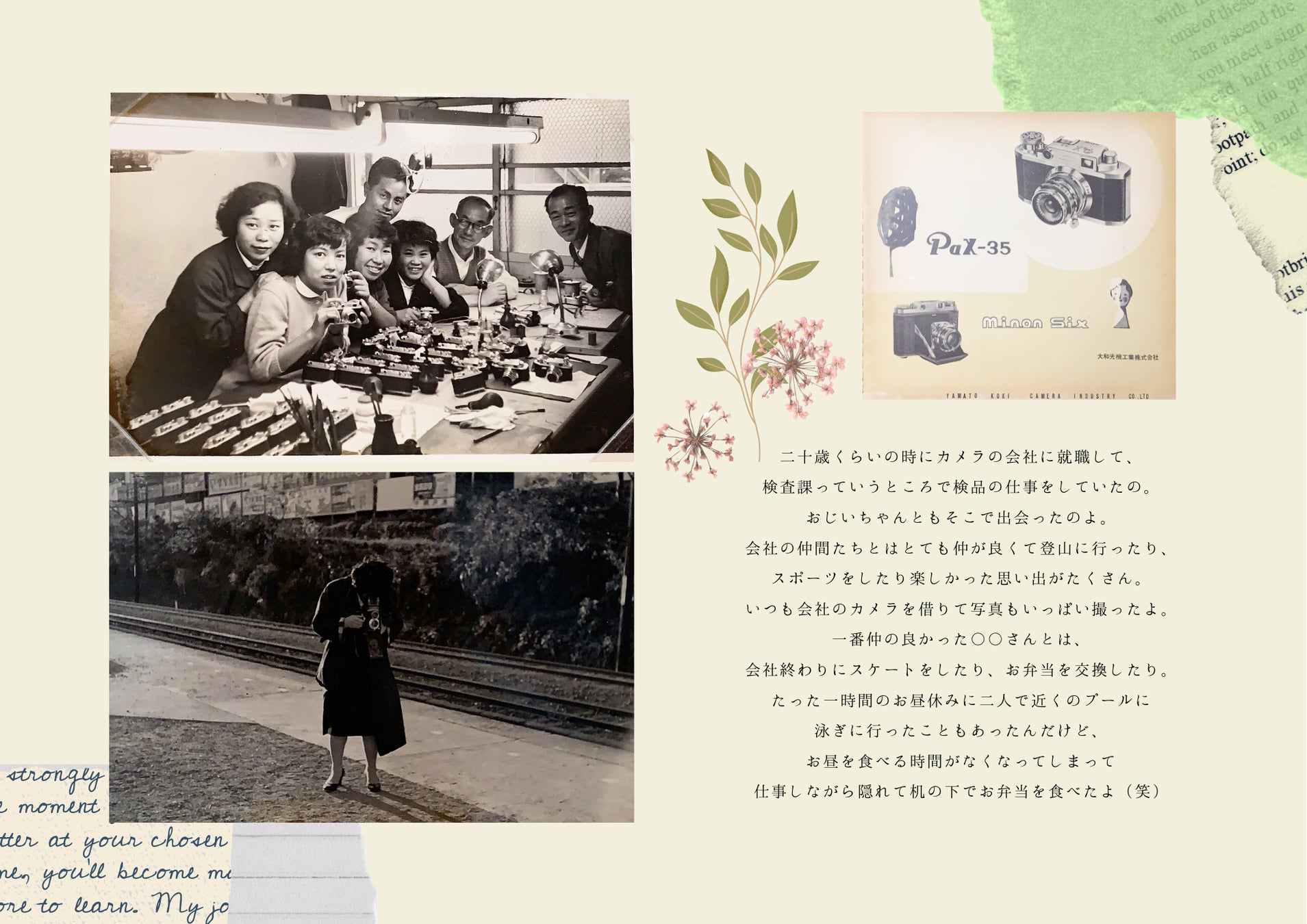 ”カメラの会社に就職して、検査課っていうところで検品をしていたの。おじいちゃんともそこで出会ったのよ。会社の仲間たちとはとても仲が良くて登山に行ったり、スポーツをしたり思い出がたくさん。… 同僚とたった1時間のお昼休みに二人で近くのプールに泳ぎに行ったこともあったんだけど、お昼を食べる時間がなくなってしまって、仕事をしながら隠れて机の下で食べたよ(笑)”