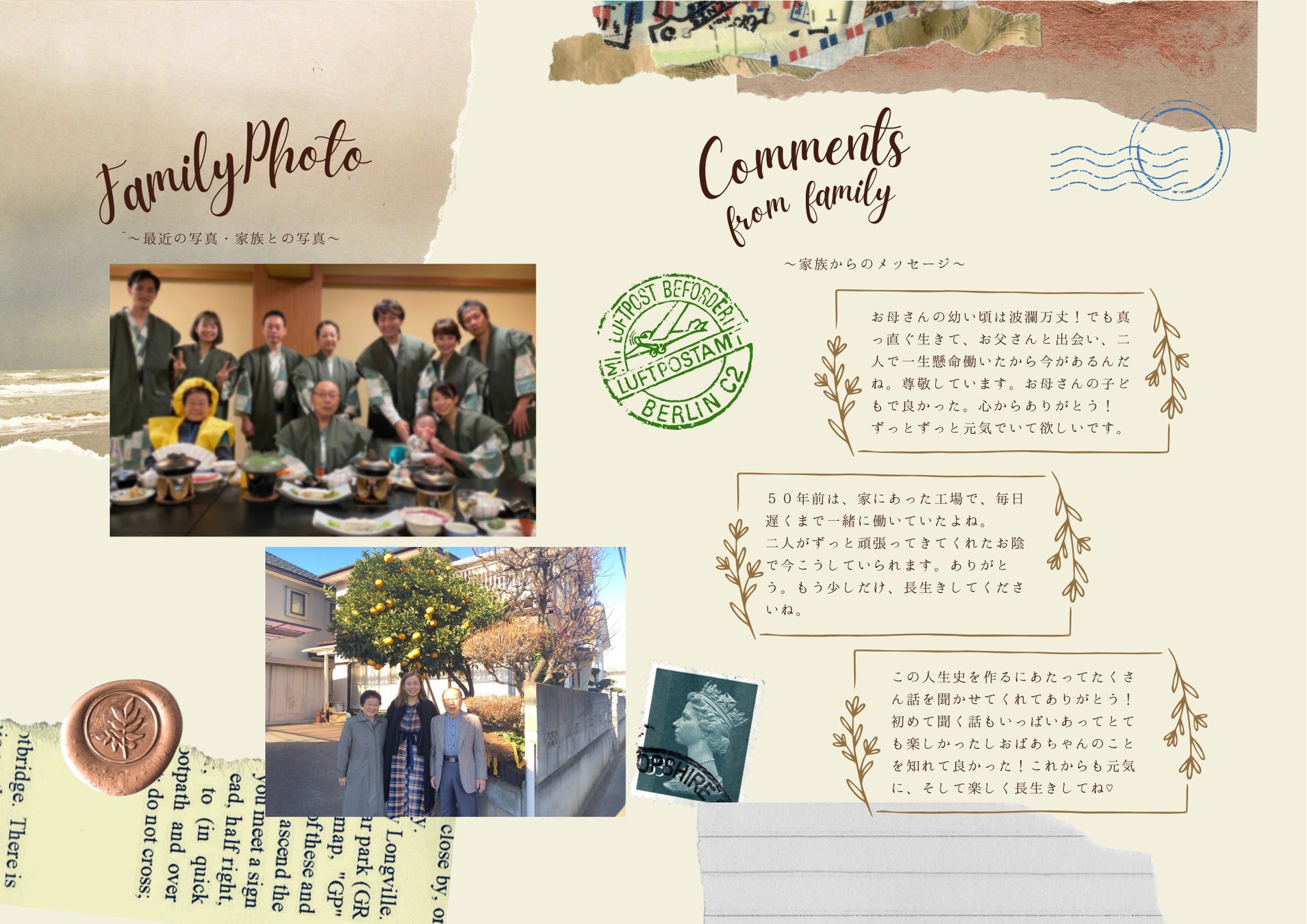 そして写真を撮ったあの日からたくさんの時間が流れた今。最後のページは、子どもや孫たちとの写真、家族からのメッセージで彩られました。