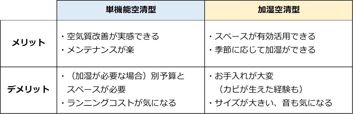 ■単機能空清と加湿空清のメリット・デメリットの比較
