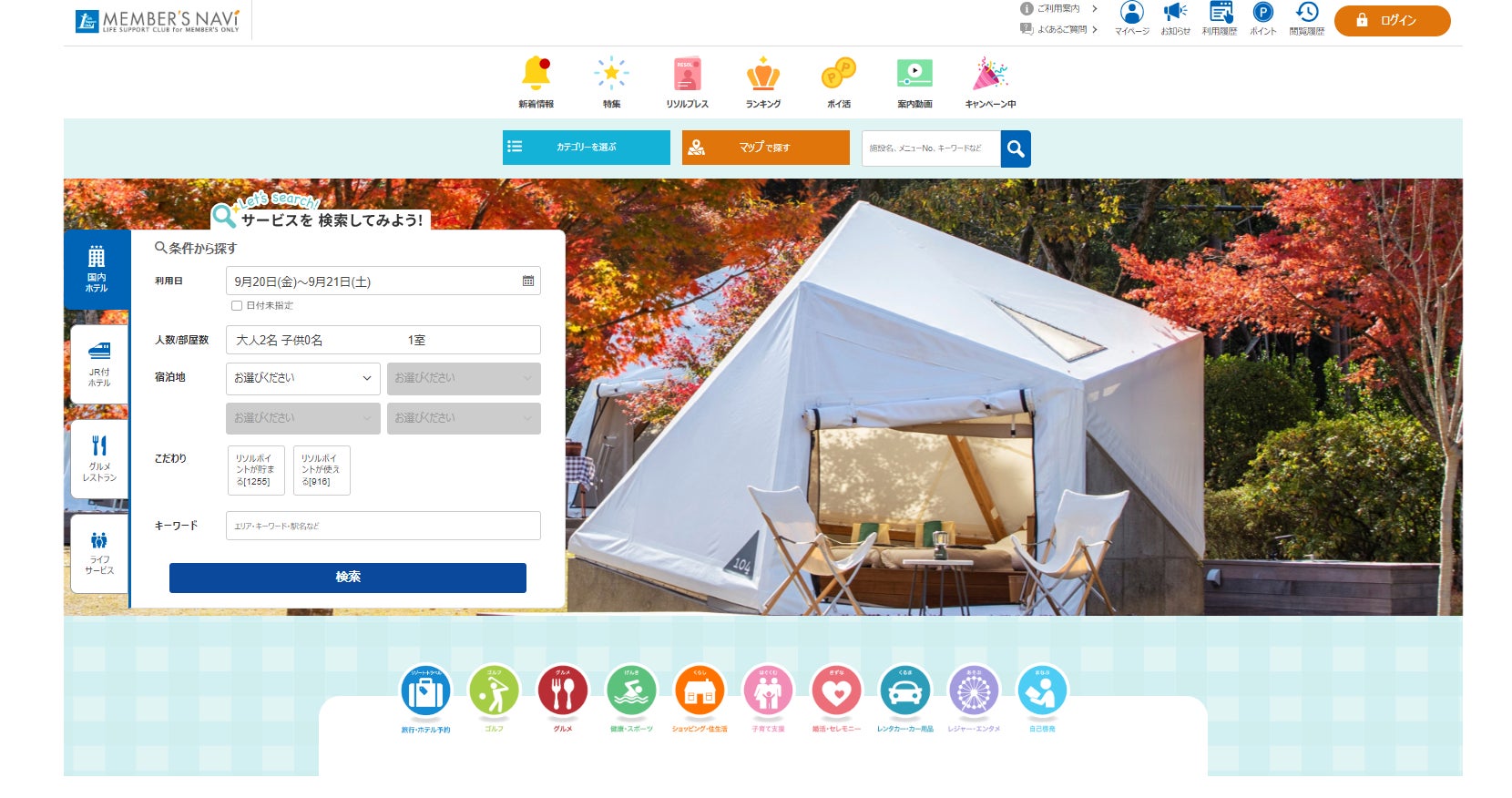 「メンバーズナビ」は、加入企業・団体の従業員向けに、旅行・グルメなどの特典情報を掲載し、予約ができるポータルサイトです。このたび、リソルライフサポートは利用施設数の大幅増に対応すべく、Webサイトのリニューアルを行い10月7日にサービスを開始しました。