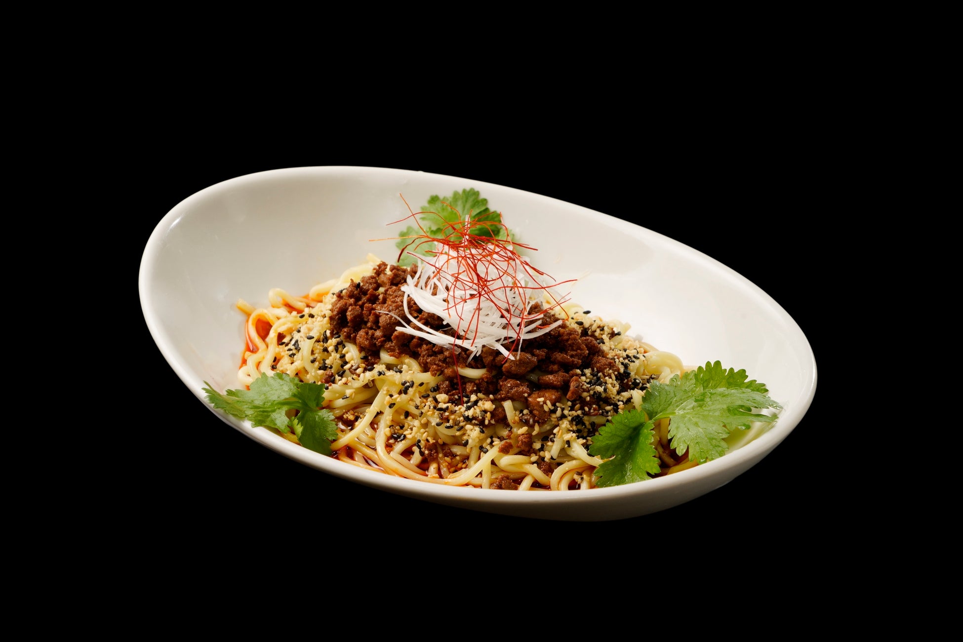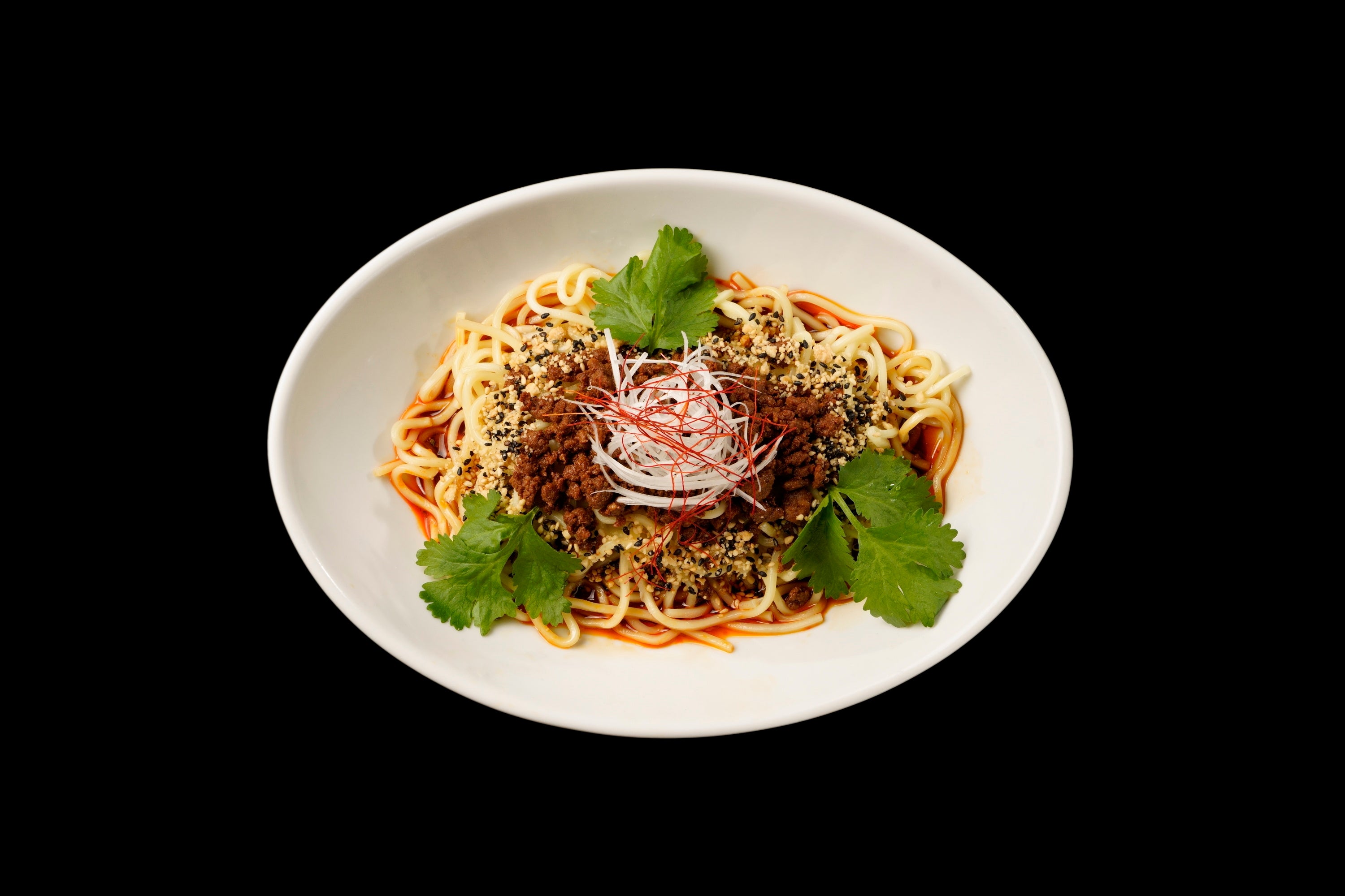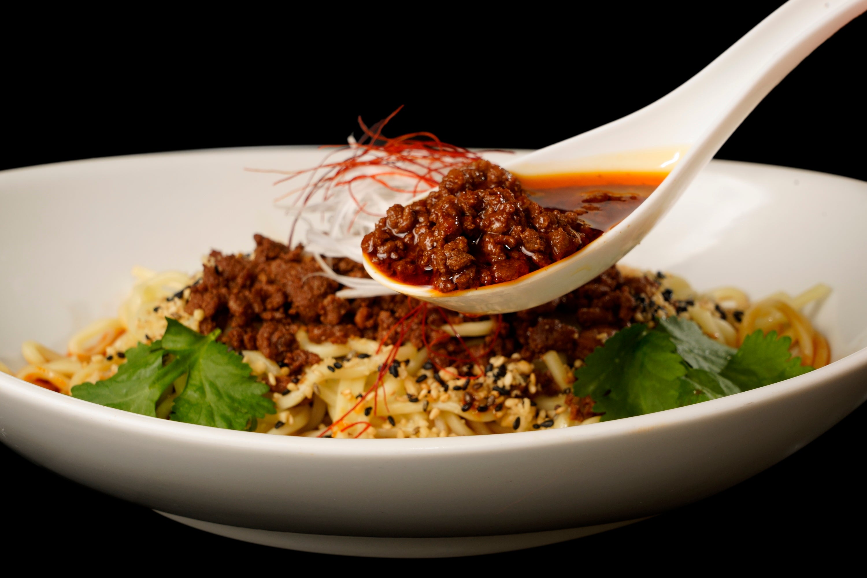 中太でモッチリとした食感の麺と、国産豚ひき肉を使用した旨みあふれる肉味噌、スパイスが効いたタレや辣油など、すべてを豪快に混ぜ合わせて楽しむ一杯です。ひとたびすすれば、店主が厳選してブレンドした山椒の香りが鼻腔にガツンと押し寄せたのち、口内ではビリリとした「シビれる」辛みを存分に堪能することができます。さらにお好みでネギやパクチーをトッピングすることで、スッキリとした風味や食感を楽しむことができオススメです。