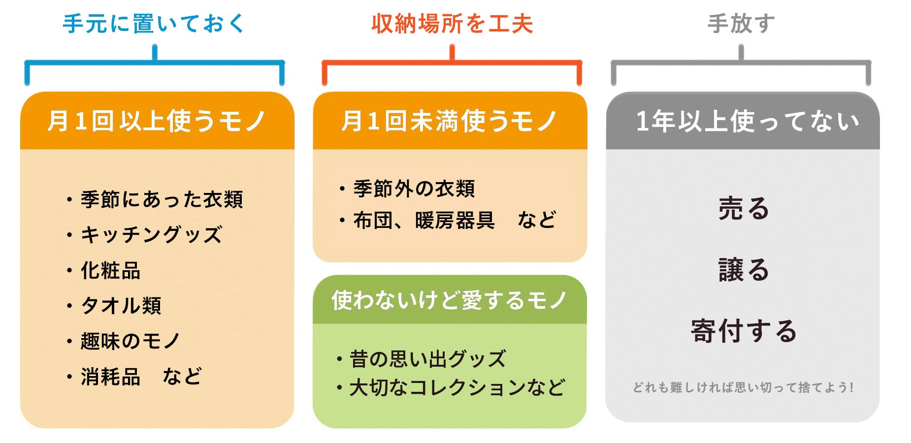 モノの整理の基本は『全部出し』。今年1年使っていないモノは、【売る・譲る・寄付する】の3つの手段を賢く活用して、捨てる罪悪感なく片付けを進めてみましょう。いまあるモノを手放すことで、また新しいモノや考えと出会うきっかけにもなります。