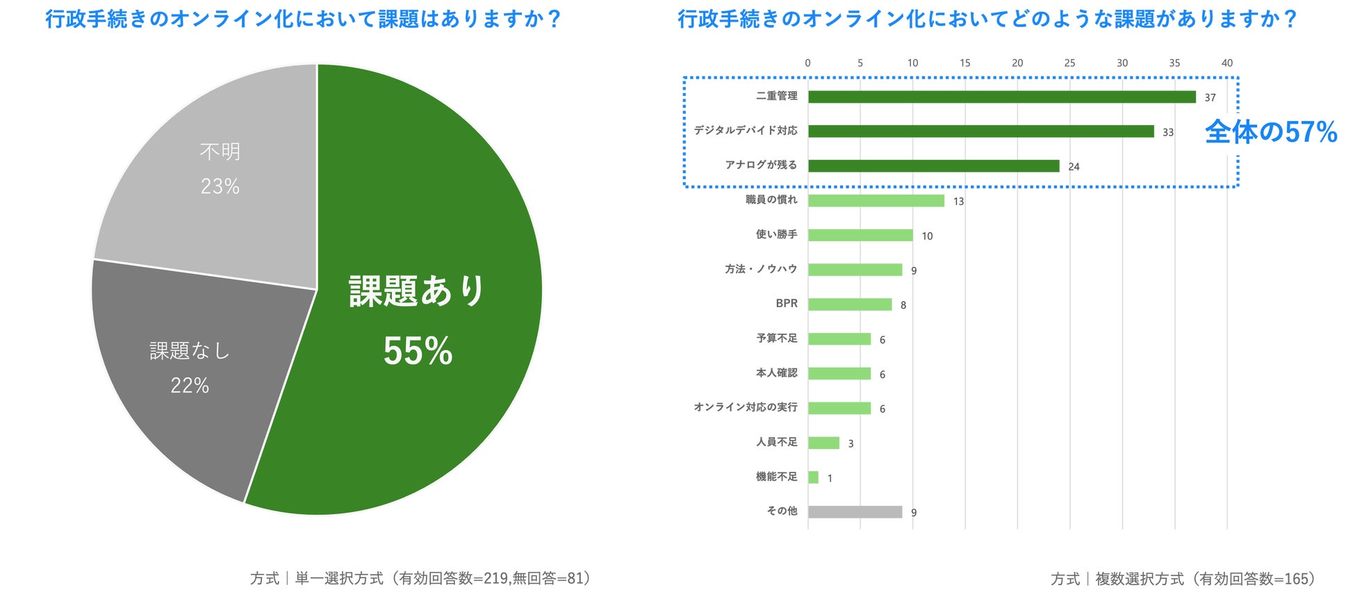 2024年6月に実施した自治体対象のアンケート(※2)では、55%の自治体が「行政手続きのオンライン化に課題を感じている」と回答しました。課題の内容については、22%が「二重管理」、20%が「デジタルデバイド対応」と回答。さらに具体的にオンライン化を進めている手続きについては「子育て関係」と回答する自治体が多く見られる結果となりました。