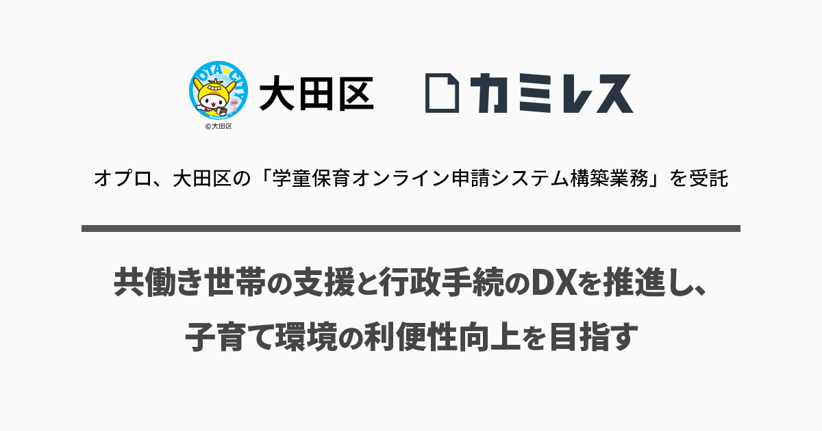 株式会社オプロ(本社:東京都中央区、代表取締役社長:里見一典、以下オプロ)は、大田区が実施した公募型プロポーザルにより、「学童保育オンライン申請システム構築業務」を受託し、契約を締結したことをお知らせいたします。