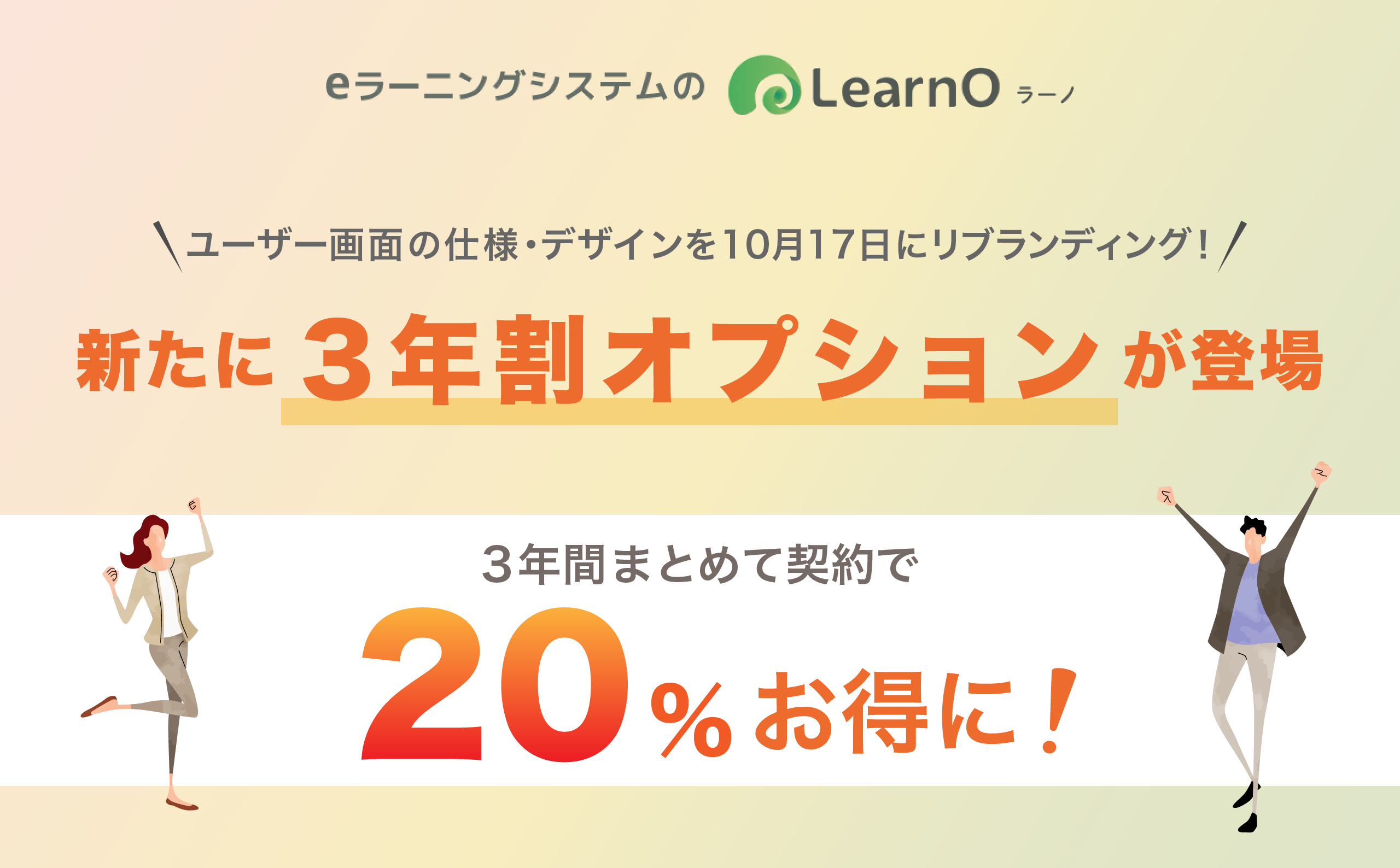 料金体制の見直しについては、長くお使い続けていただけるよう、3年割オプション※が登場します。LearnOを3年間まとめて契約いただいたお客様は、利用料が定価より20%引きとなります。