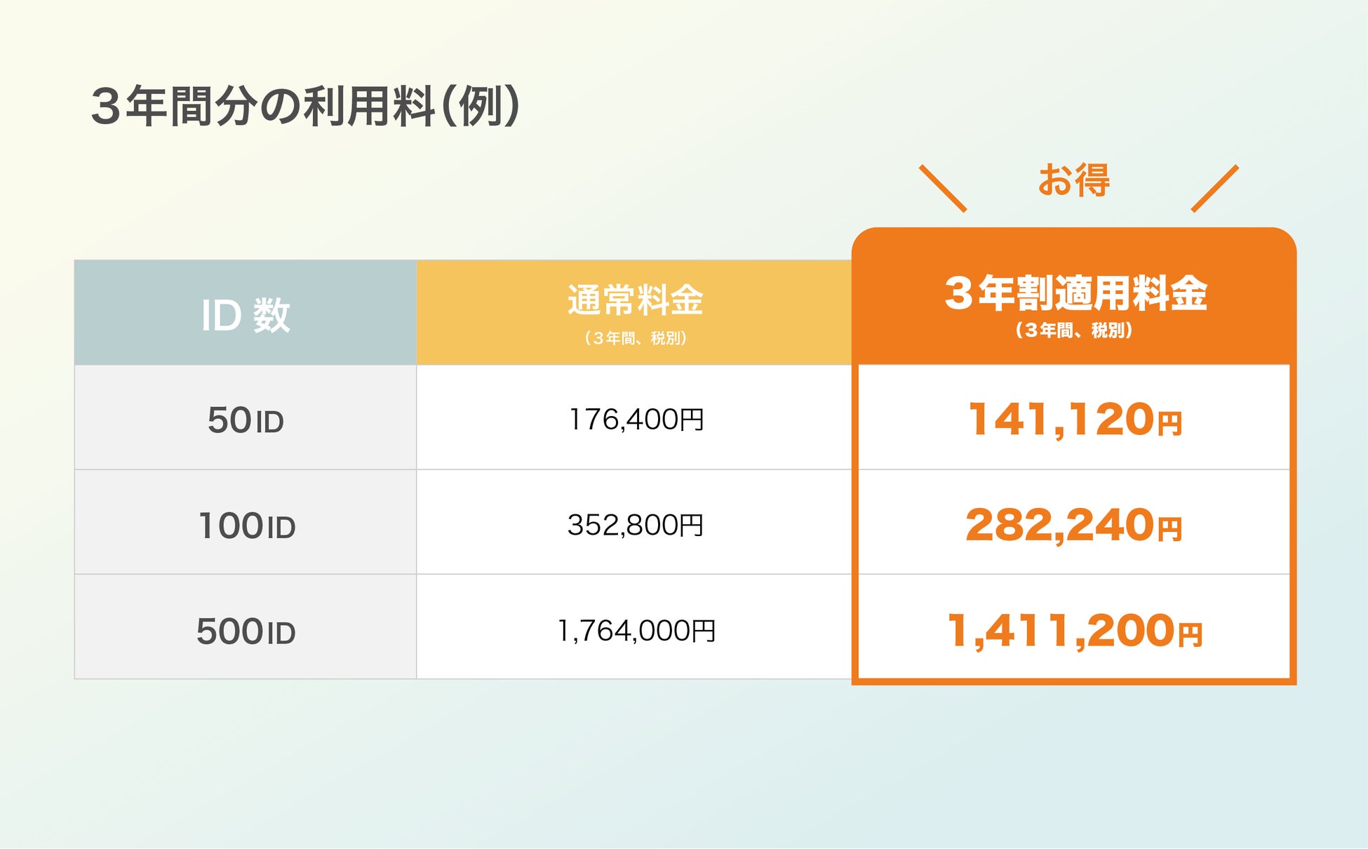 例えば、格安プランの50IDをご契約頂く場合、通常のご契約では3年間で176,400円(税別)となるところ、3年割を適用することで141,120円(税別)となり、35,280円お得になります。また、3年割オプションは標準プランでもご利用いただけます。