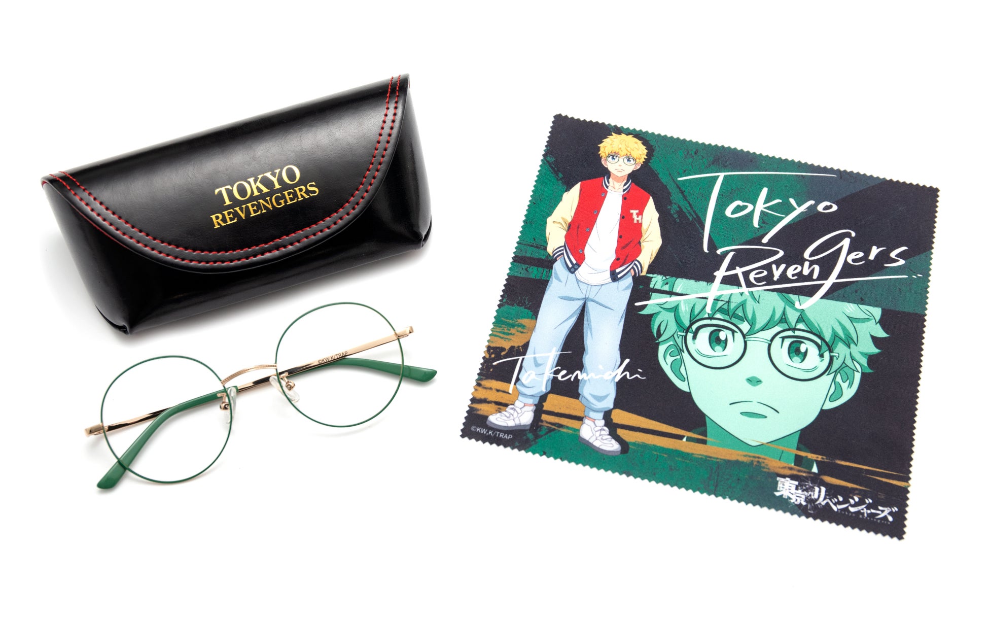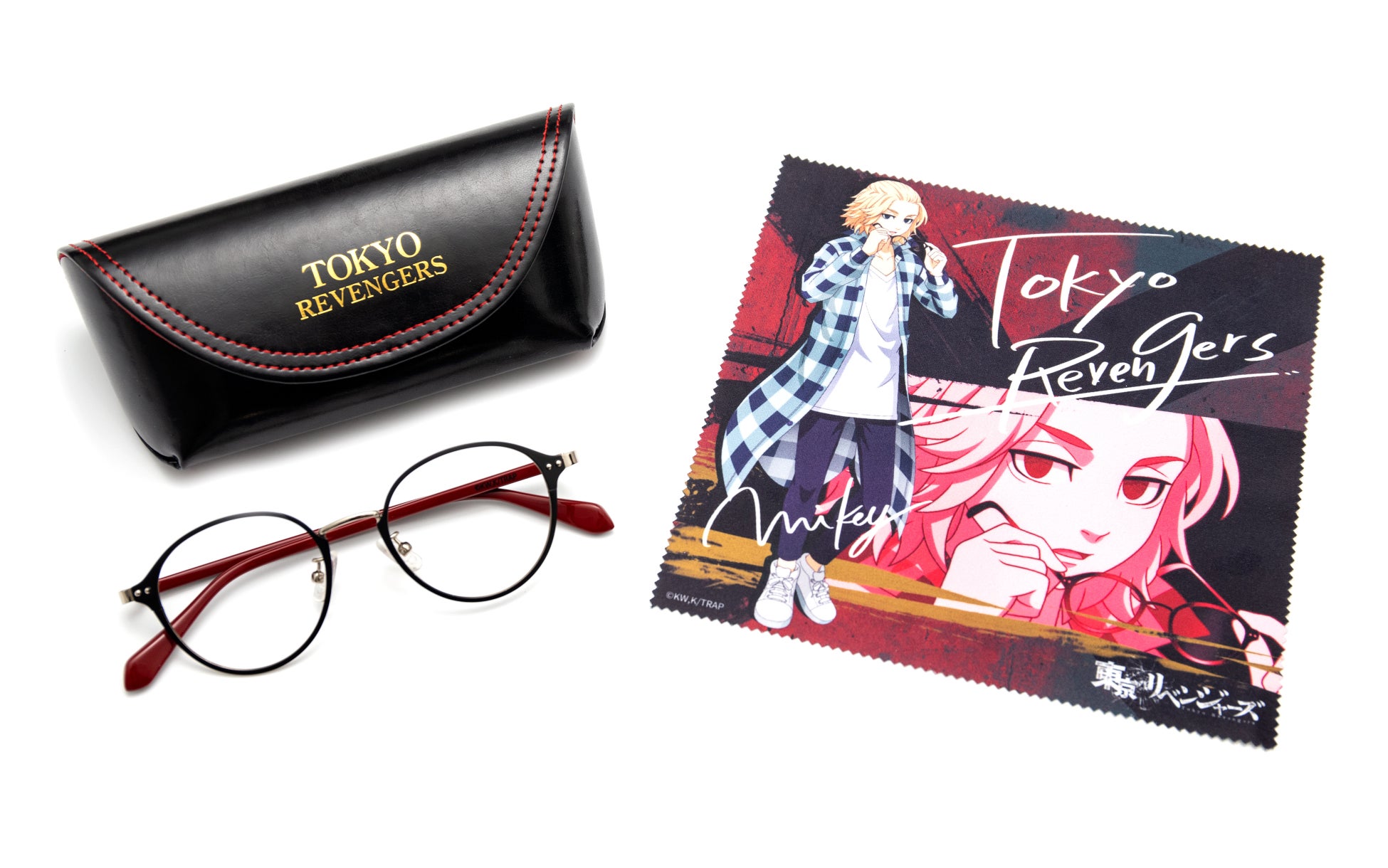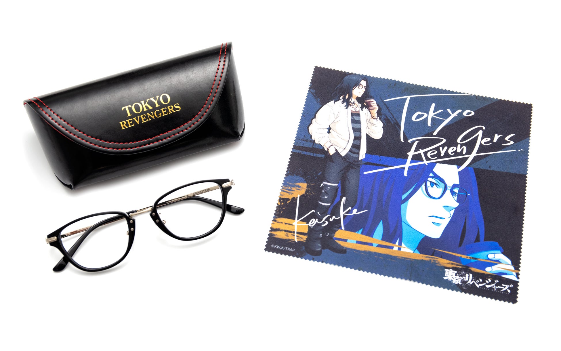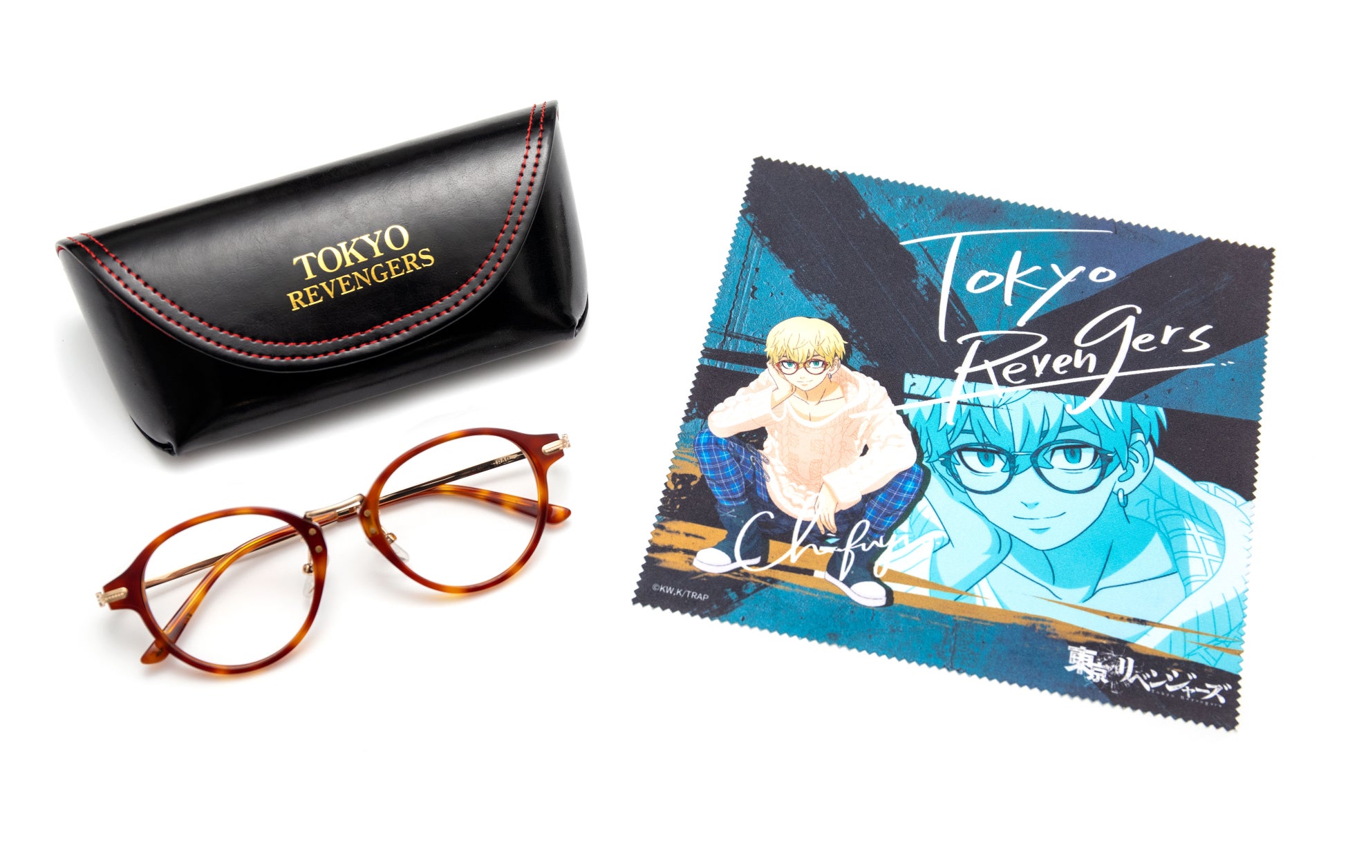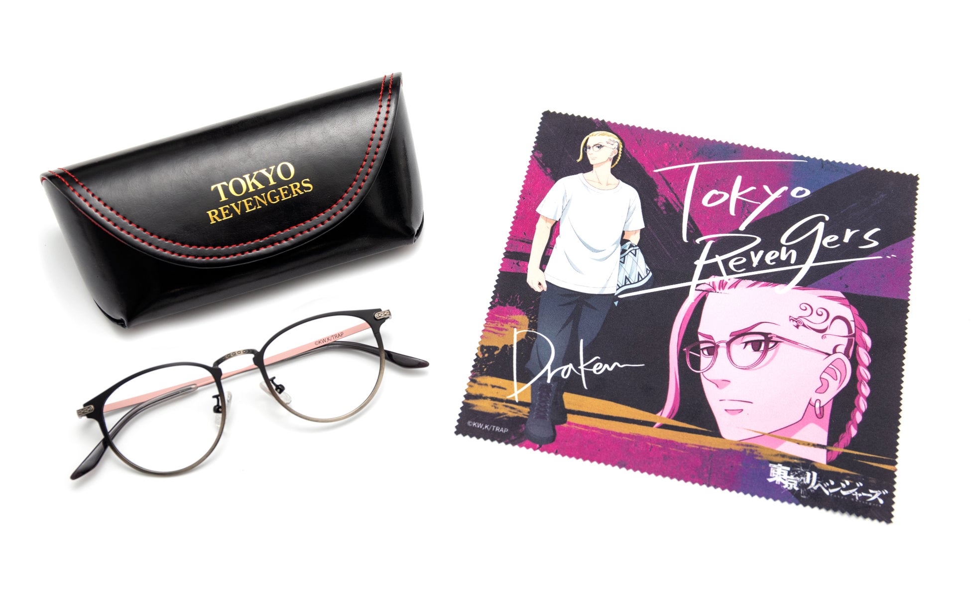 各キャラクターの雰囲気に合わせたデザインで、メガネの形状や素材は普段使いしやすい仕様に仕上げました。モダン(耳にかかる部分)の先には、キャラクターそれぞれのイニシャルを刻印。本アイテム限定の描き下ろしイラストをデザインしたメガネ拭きと「TOKYO REVENGERS」の箔押し入り・特製メガネケースをセットにしてお届けします。男女問わずご使用いただける、ベーシックなシリーズです。