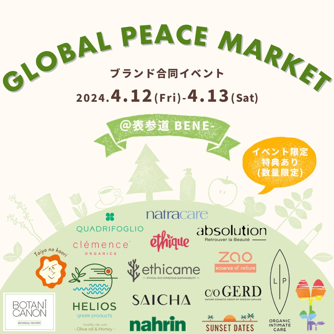 株式会社ピー・エス・インターナショナル(本社:東京都港区、代表取締役会長兼社長兼CEO 浜口 直太)が運営する、環境・社会・人に優しい製品を取り扱い、健康的なライフスタイルの提案を行う「ethicame(以下『エシカミー』)https://ethicame.com/ 」は、2024年4月12日(金)と4月13日(土)に表参道「BENE-(東京都港区)https://www.crazy.co.jp/bene/ 」で開催される、16ブランドによる合同イベント「GLOBAL PEACE MARKET(グローバルピースマーケット)」に出展し、製品のご案内と販売を行います。