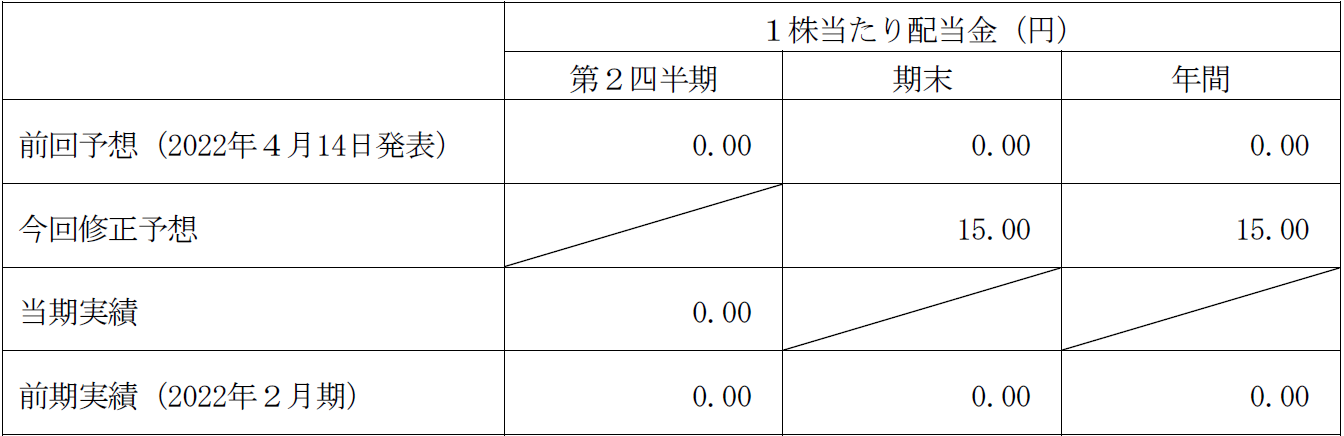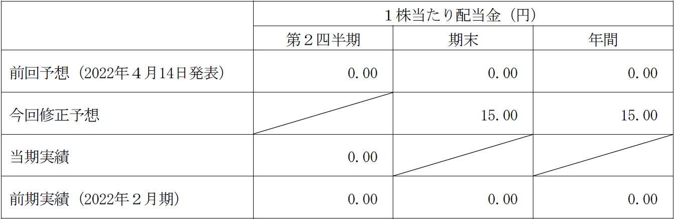 上記の配当方針の変更に伴い、2023年2月期の期末配当予想を1株当たり15円に修正いたします。