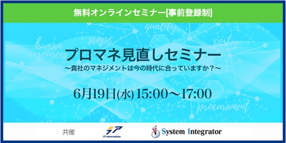 株式会社システムインテグレータ(本社:さいたま市中央区、代表取締役社長:引屋敷 智、東証スタンダード:証券コード3826)は、株式会社アイ・ティ・イノベーション(本社:東京都品川区、代表取締役:林 衛)と共催で、「プロマネ見直しセミナー~貴社のマネジメントは今の時代に合っていますか?~」と題した無料ウェビナーを、2024年6月19日(水)に開催することをお知らせします。