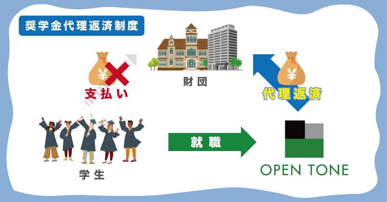 株式会社オープントーンは2022年4月より、社員に対する奨学金の代理返済制度を施行し実施しています。既に複数名の既存社員と新規採用社員に適用・運用されています。代理返済は給与待遇の外側で行われ、財団等に対する返済の月額全額を当社負担で実施する制度です。
