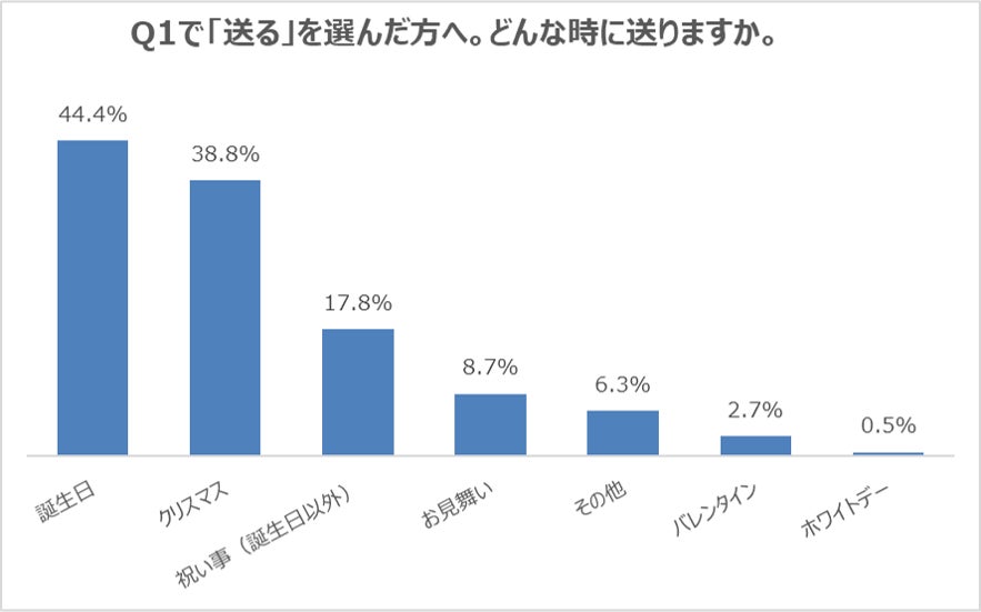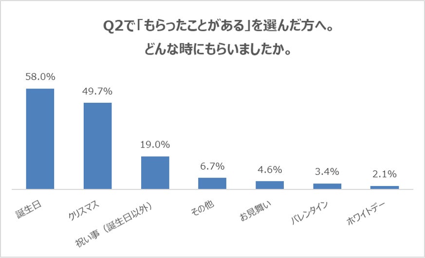 その他にも、結婚記念日、退職や転勤、母の日、敬老の日、お世話になった人へお礼、お見舞いなど様々なシーンでのエピソードも寄せられました。