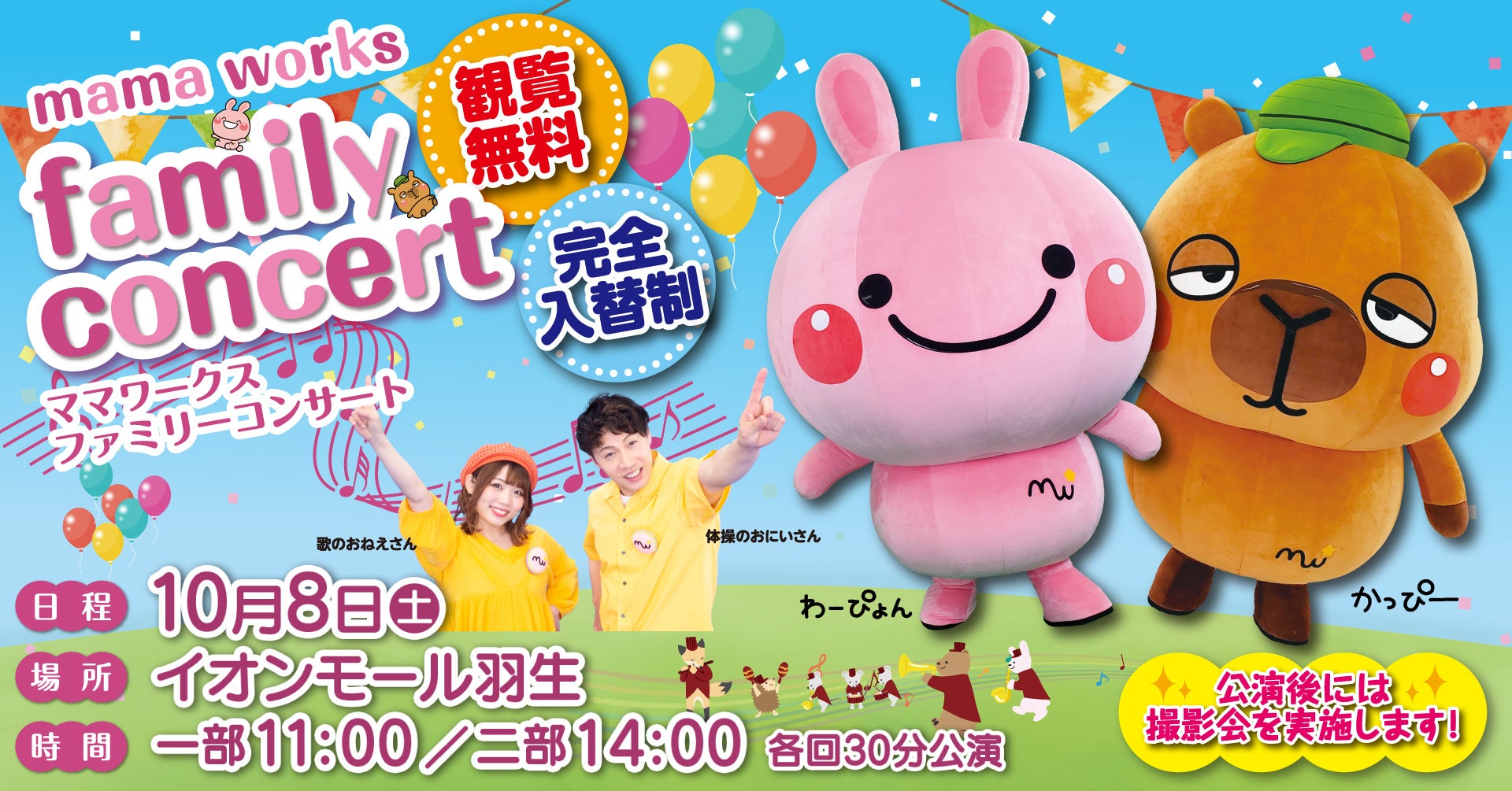 ママワークス公式キャラクターのわーぴょん&かっぴー、そして歌のおねえさんや体操のおにいさんが繰り広げる楽しく歌って踊れるファミリーコンサートです。