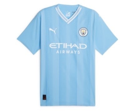 2023-24新ユニフォームは、このレガシーの証であり、「エティハド スタジアム」とこの地をホームとするすべての人びとへの祝福の意を込めています。ユニフォームのデザインは、「エティハド スタジアム」の象徴的な特徴に敬意を表し、移転後の初シーズンに着用されたユニフォームからインスパイアされています。グラフィックは、ユニークなスタジアムのデザインからインスピレーションを得ており、スタジアムの外から見える4つの巨大な塔をモチーフに同系色のストライプを施しました。また、新スタジアムで初めて使用された2003/04シーズンのホームユニフォームをイメージした白いVネックの襟も特徴です。