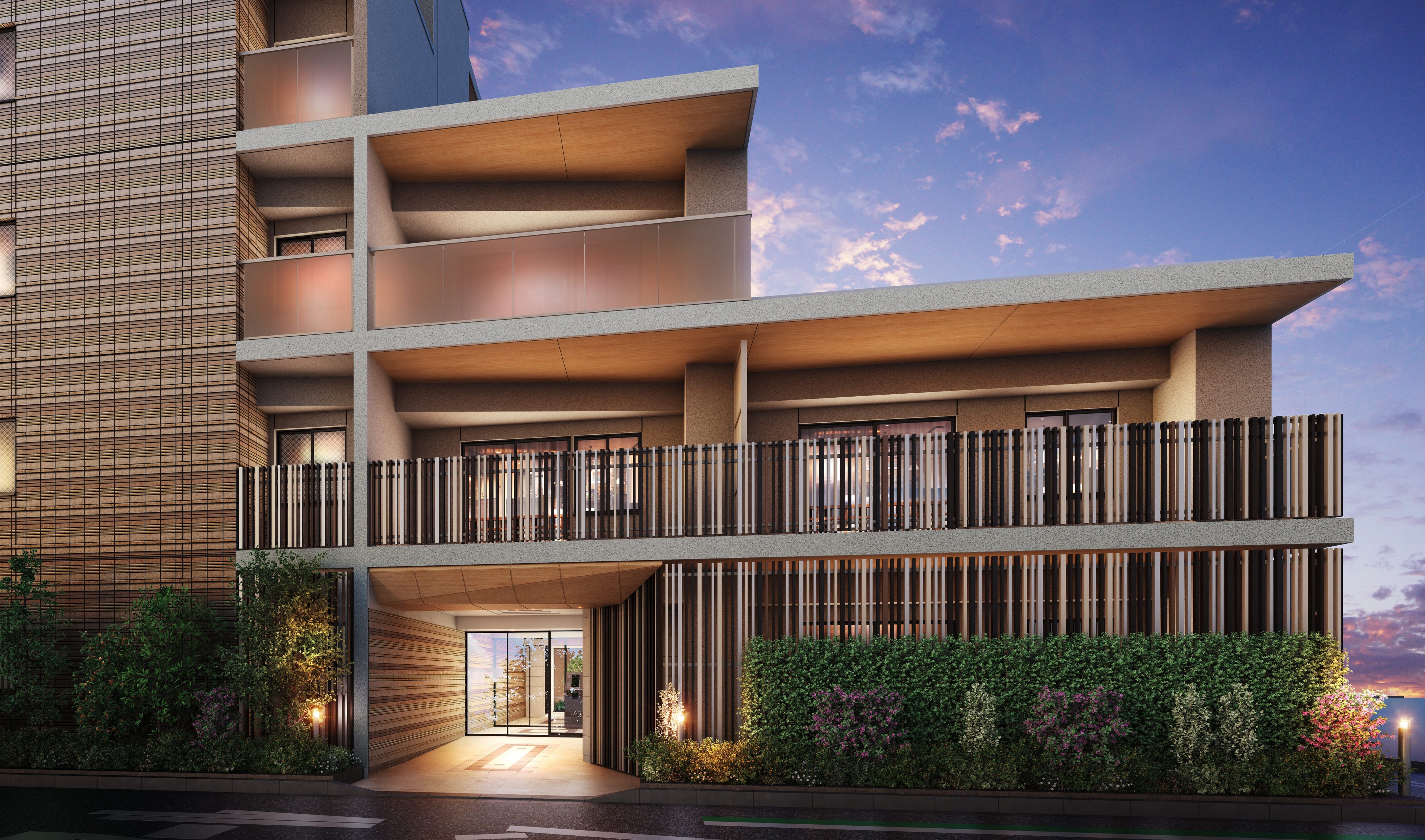 ※掲載の完成予想CGは、計画段階の図面を基に描き起こしたもので、形状・色等は実際とは異なります。形状の細部・設備機器・配管等は省略または簡略化の上、表現しております。植木・植栽は、特定の季節やご入居時の状態を想定して描かれたものではありません。実際に植樹する樹形、枝ぶり、葉や色合い等が異なる場合があります。尚、竣工時には完成予想CG程度には成長しておりません。